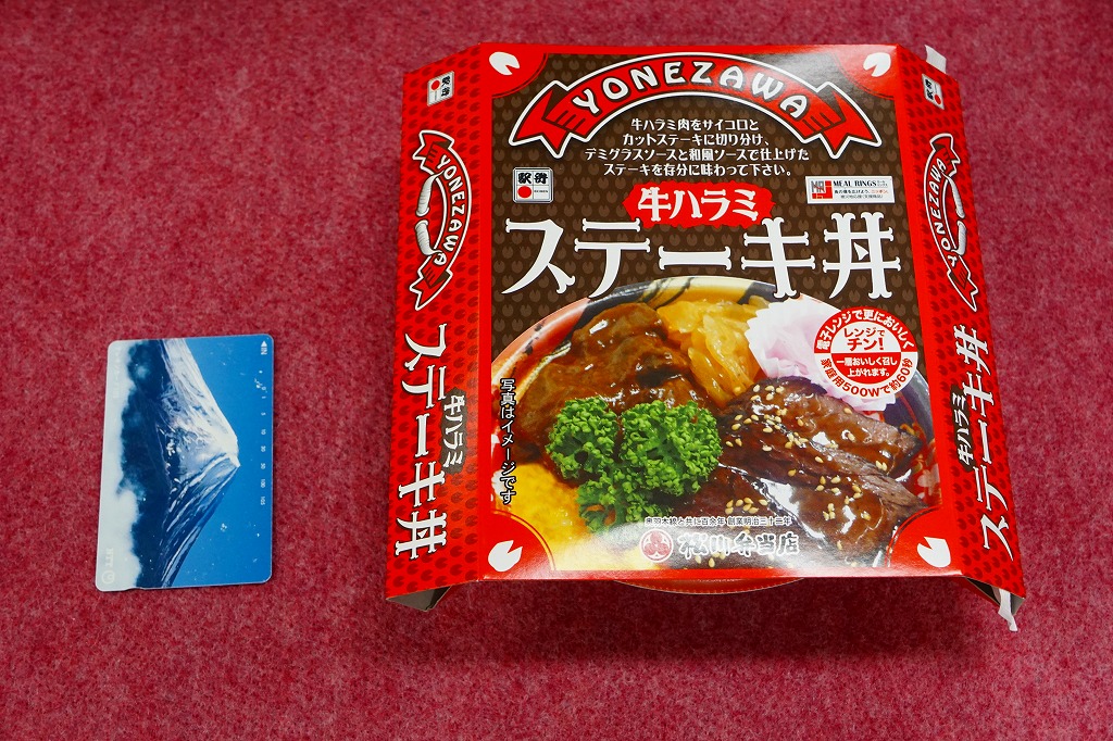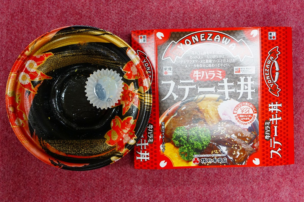 2014(平成26)年4月の発売か。駅弁の名前のとおり、そしてパッケージの写真のとおり、丼に白御飯を敷き、牛ハラミ肉のサイコロステーキとカットステーキ、タマネギ炒め、スクランブルエッグ、ダイコン酢漬けで覆う牛肉丼。冷たいのに柔らかくかみ切れる牛焼肉の味を、タマゴとタマネギがうまく補佐する。