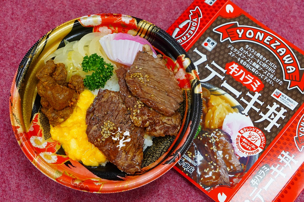 2017(平成29)年12月に東京駅や上野駅で販売、翌2018(平成30)年1月に京王百貨店の駅弁大会で販売。円形の加熱機能付き容器に、レンコンやパプリカも入る牛ステーキ丼と、ニンジンやゴボウなどの煮物も入る牛すきやき丼と、漬物を詰める。加熱機能付き駅弁のイメージを覆す白飯の多さで、分量は十分。2019年までの販売、2021年までの掲載か。
