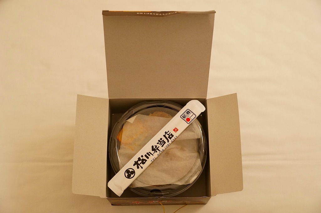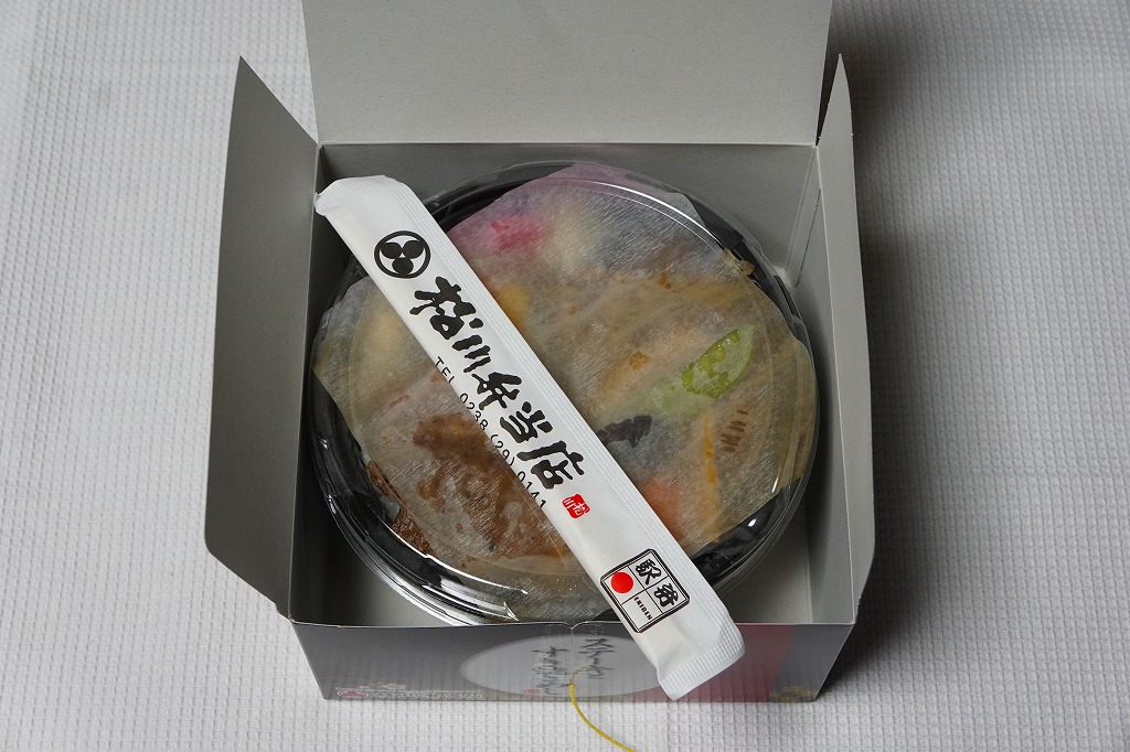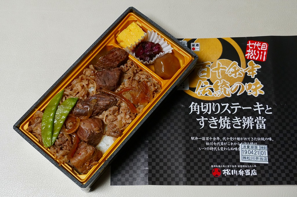 秋冬の駅弁大会シーズンに向けた、2018(平成30)年秋の新商品か。掛紙には「七代目松川」や「百十余年伝統の味」のキャッチが目立つ。中身は白飯+牛肉+付合せという、牛肉駅弁で定番の構成。牛肉煮に加えて斜めに5個配置した牛角切りステーキは、焼き鳥大で弾力があり、常温の弁当で食べやすいものになっていた。2022年までの設定か。