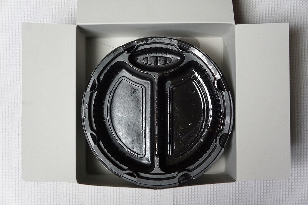 牛焼肉の内訳は、添付のしおりに書かれるとおり、「赤身肉(塩・胡椒)」「サイコロ(塩・胡椒)」「カルビ(塩・胡椒)」「タン(塩・胡椒)」「カルビ(西京風味噌ダレ」「ハラミ(塩・胡椒)」。これらが焼肉の姿のまま、6区画に2個ずつ収まる仕様。常温と高価格が気にならなければ、これはおもしろいつくり。2018年までの販売か。