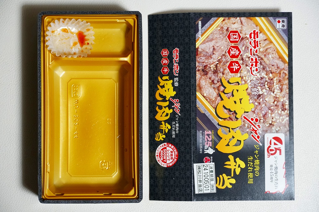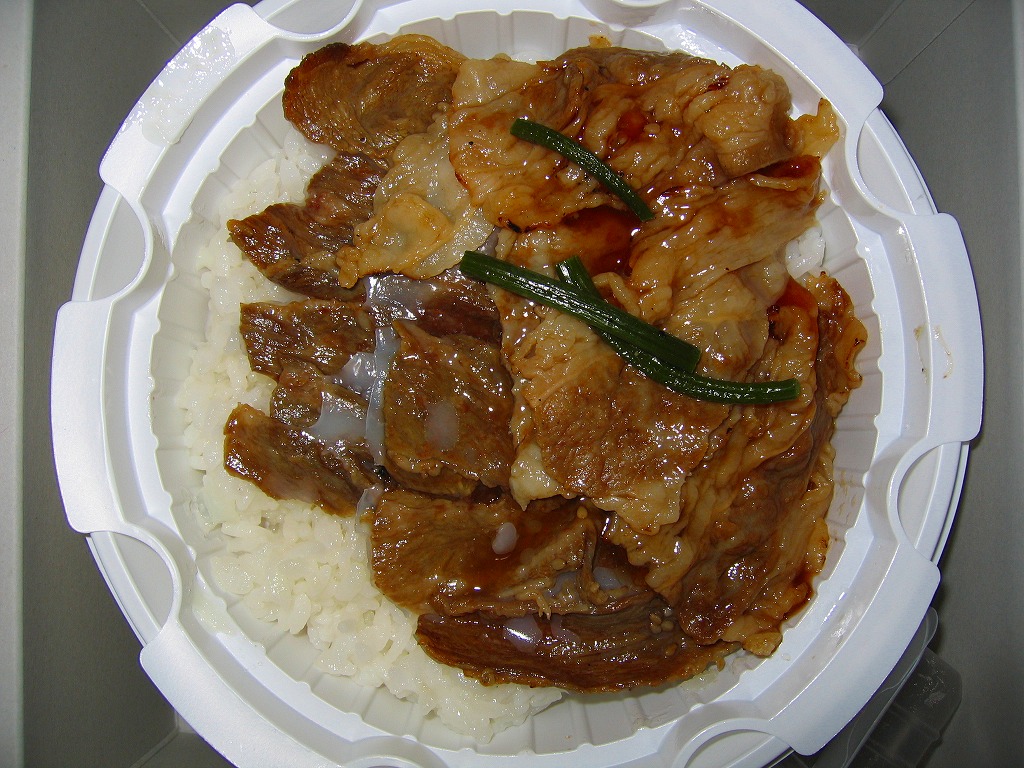 2003(平成15)年の秋に発売。白い円形の加熱機能付き容器を、焼肉の写真を載せた賑やかなボール紙のパッケージに入れる。中身はとてもシンプルで、薄く敷いた御飯の上に牛カルビ肉を載せるだけ。ひもを引いて暖めると確かに、タレと脂身に支えられたカルビ焼肉の風味が出て、分量のある牛肉は柔らかく、御飯が足りなくなる感じ。価格は2004年の購入時で1,000円、2010年時点で1,100円、2014年時点で1,150円、2017年時点で1,200円、2020年時点で1,300円、2021年時点で1,150円、2022年時点で1,250円、2023年時点で1,280円。