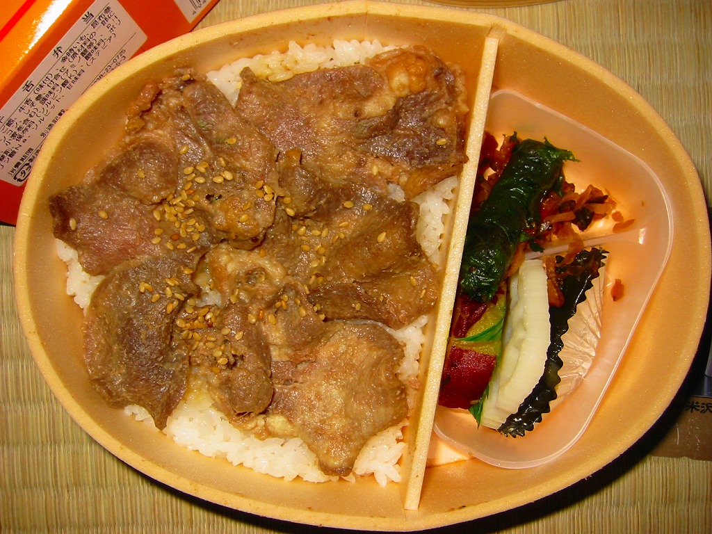2001(平成13)年4月に発売。フルカラー写真を掲載した豪華なボール紙製のパッケージの中に、木目を印刷した発泡スチロール製の長方形の容器が入り、牛サイコロステーキを4個串刺しにした牛串が2本、白御飯の上に載る。160gも使ったという肉の風味を引き立てるタレに、常温なのに口の中で溶けてゆく食感。付け合わせの大切りのゴボウも負けてはいない。冷蔵でも悪くない味。価格は2005年の購入時で1,000円、2010年時点で1,100円、2014年時点で1,150円。