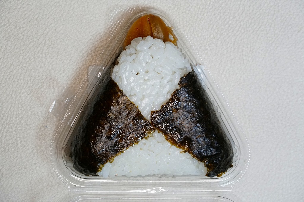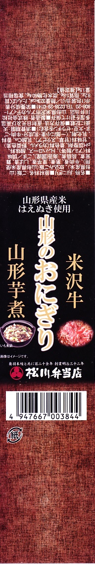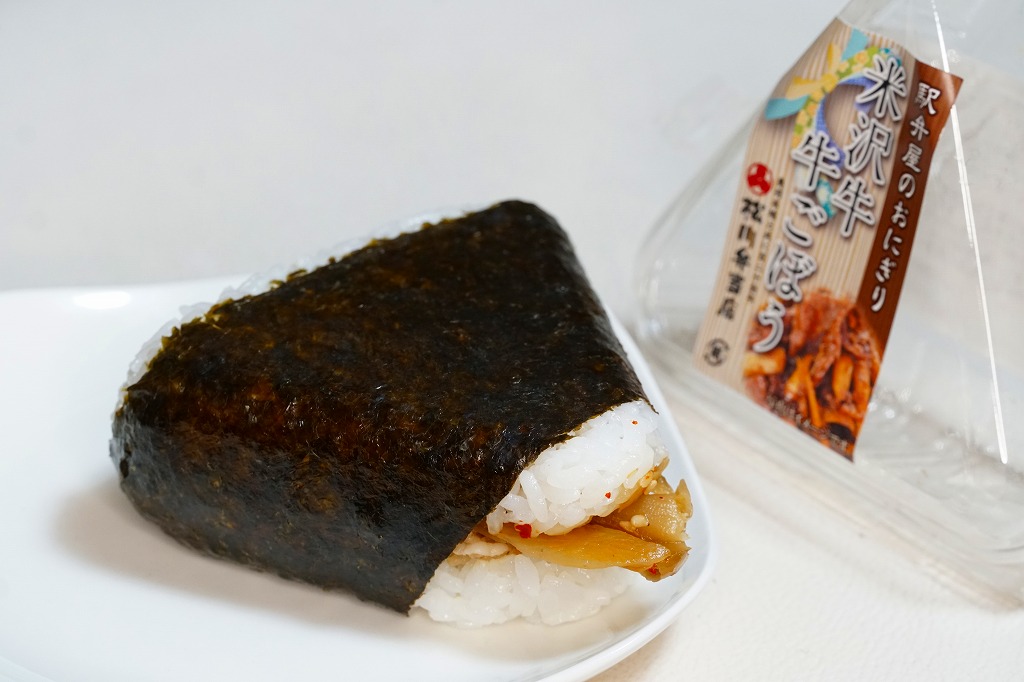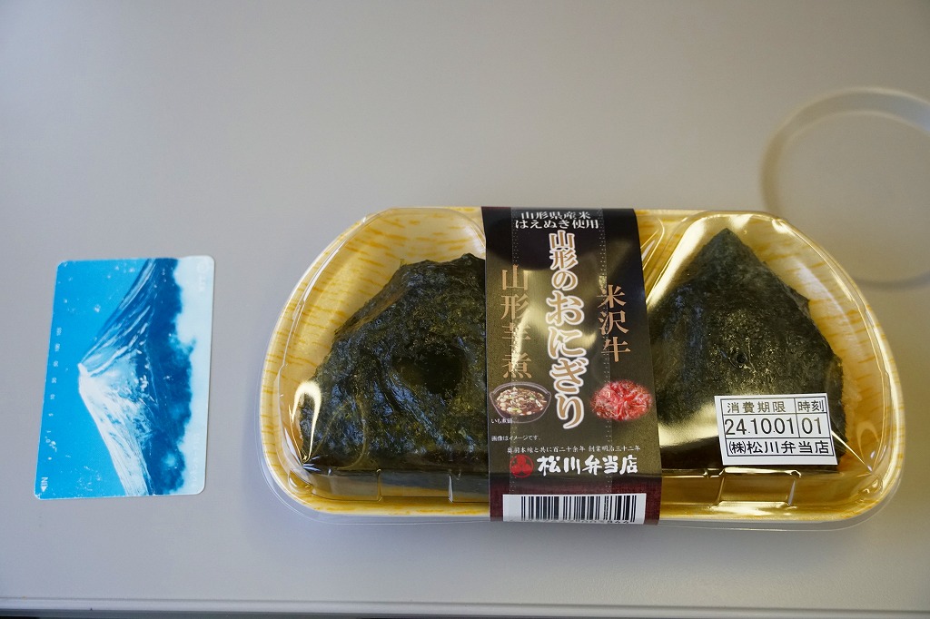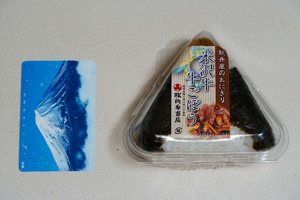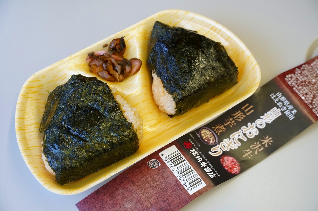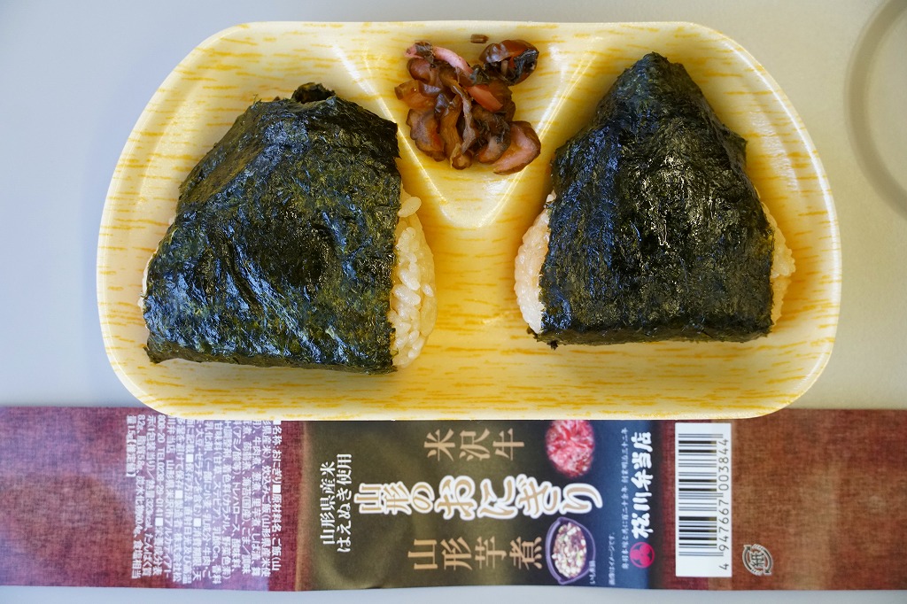 2024(令和6)年9月16日に米沢駅から山形駅までの駅の売店「ニューデイズ」で発売か。食品トレーのくぼみに、白飯に牛肉煮を入れて海苔を直巻きした三角おにぎりと、炊込飯にネギとサトイモとマイタケとこんにゃくを入れて海苔を直巻きした三角おにぎりをひとつずつ並べ、しば漬けを添える。山形県産米はえぬきの使用をうたう、米沢牛おにぎりと、山形芋煮おにぎり。コンビニの惣菜ではあるけれど、調製元が米沢駅の駅弁屋で、そう分かる紙帯を巻いたので、小さな駅弁として新幹線で味わった。