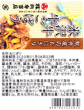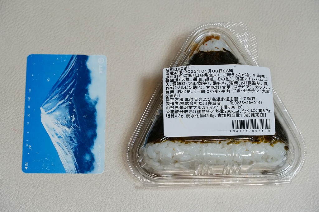 2023(令和5)年1月の京王百貨店の駅弁大会で販売。現物からは読み取れないが、「SDGs×駅弁」として「人気駅弁の端材おにぎりでフードロス削減」と広告し、3種類または5種類のおにぎりを輸送販売した。これはどの米沢駅弁のものか定かでないが、松川弁当店で多種の牛肉駅弁に入る牛肉とごぼうのものだろう。 白飯で牛肉煮とごぼうささがきを挟み、海苔で巻いた三角おにぎりを1個、商品紹介と食品表示のラベルを貼ったプラ製ケースに収めたもの。いつかどこかで売られるように、なるかどうか。