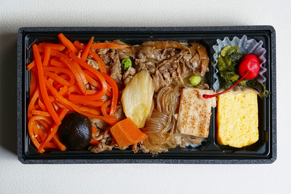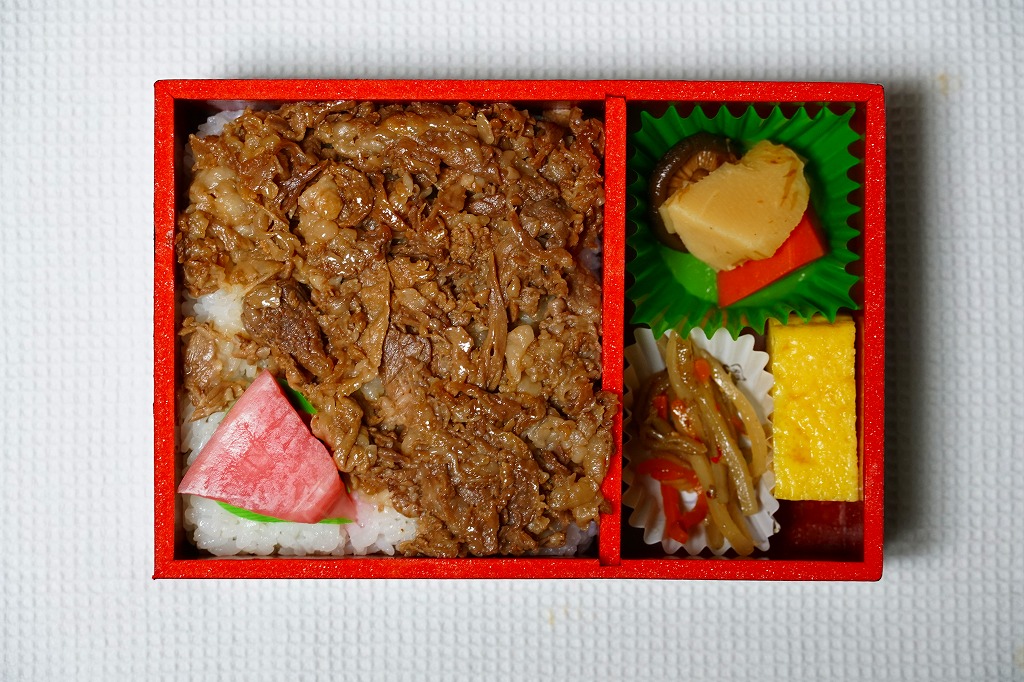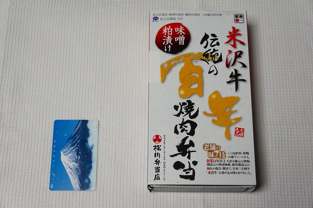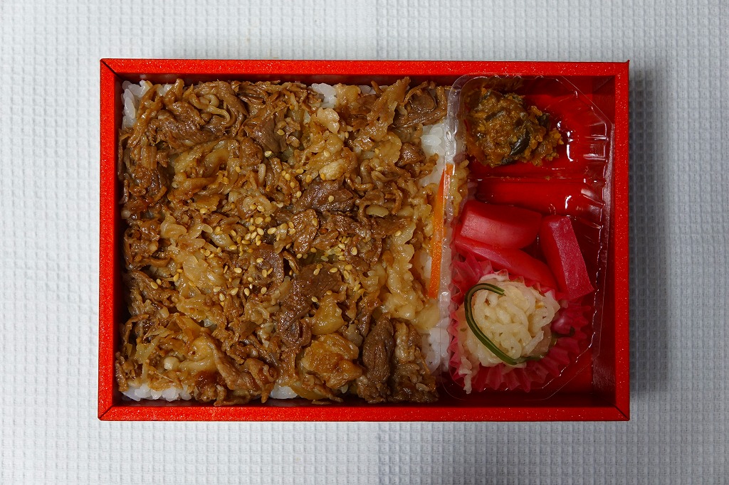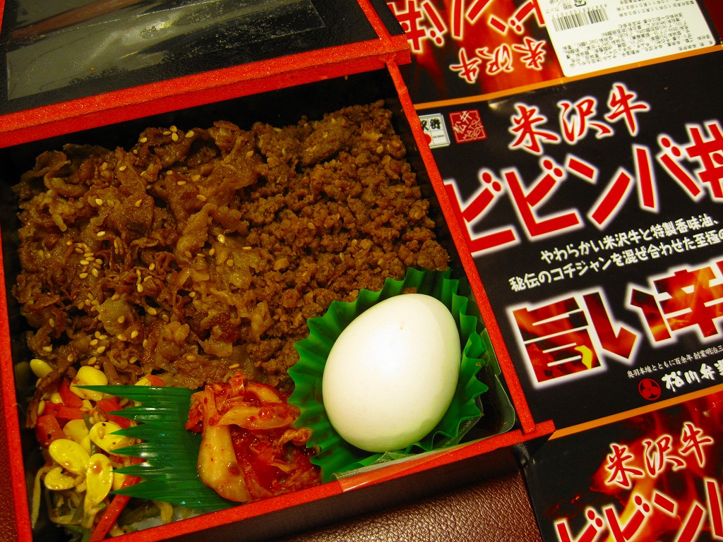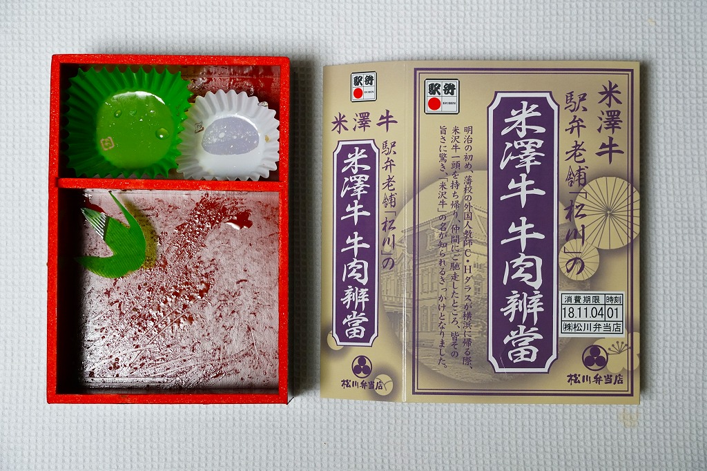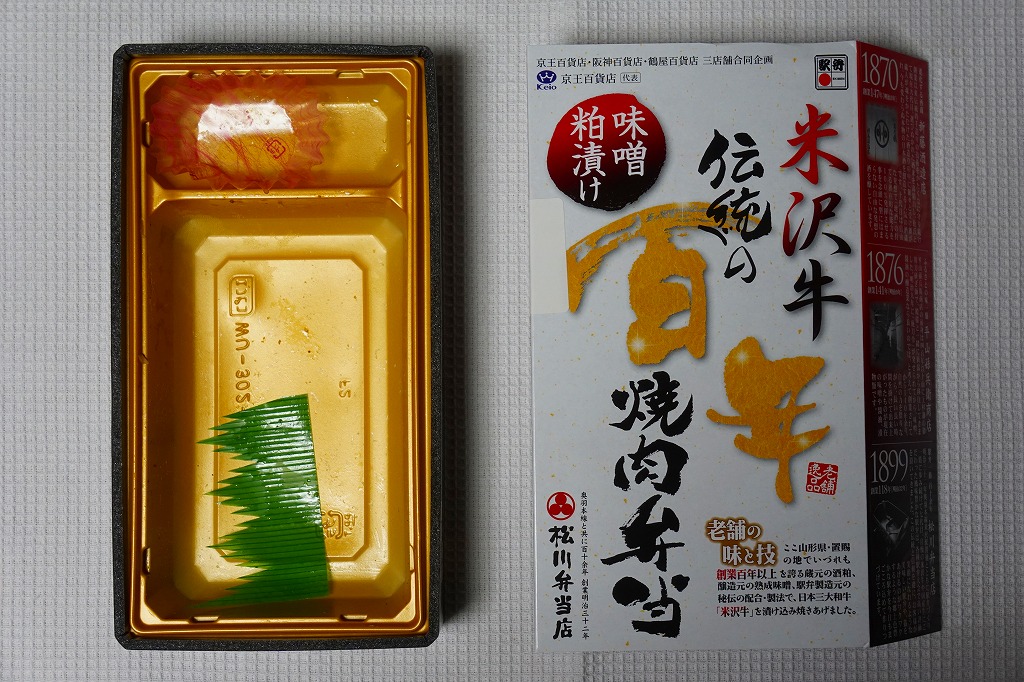 2021(令和3)年1月の京王百貨店の駅弁大会で実演販売。白飯を米沢牛の、黒く艶やかな牛肉煮と牛焼肉で覆い、玉子焼、いも煮風の煮物、切り干し大根を添付。ここでは名前も値段も華やかな、イベント向け商品の感。味はこってり。