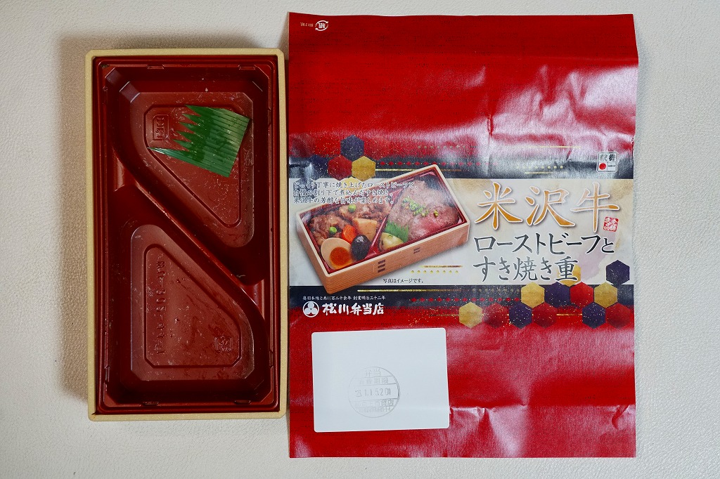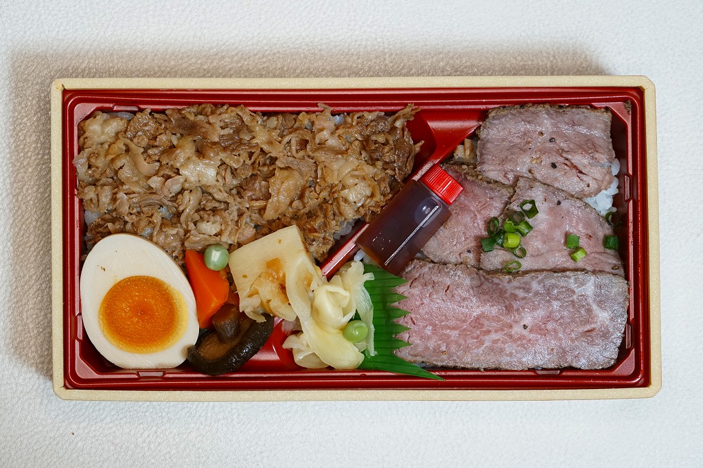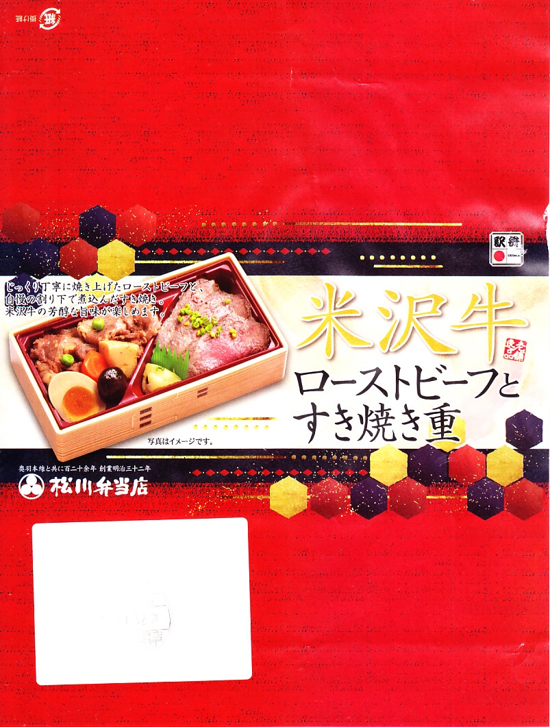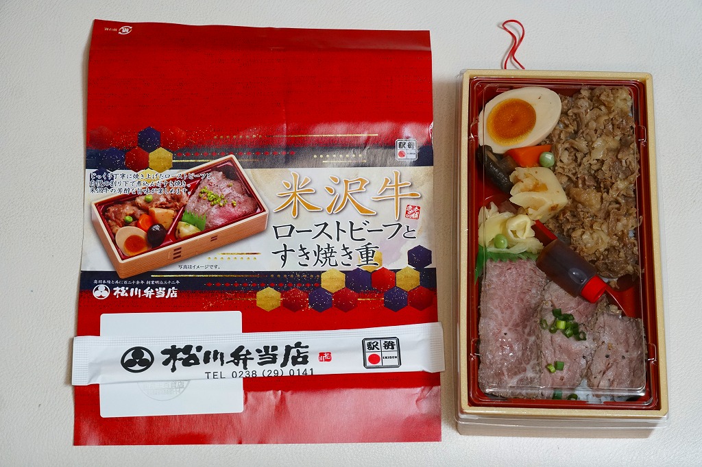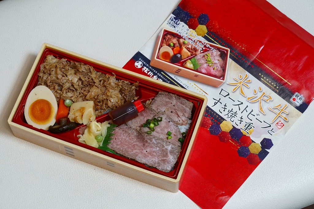 2023(令和5)年1月の京王百貨店の駅弁大会で実演販売。長方形のプラ容器に、白飯をローストビーフで覆いタレとネギを添えるローストビーフ丼と、白飯を牛肉煮で覆い煮玉子と煮物を添えるすき焼き重を詰めた。商品名と中身の写真を掲載した掛紙によると、そのいずれにも米沢牛を使うといい、薄めで霜降りの脂身ゆたかな肉が上品に思えた。1,980円という価格は、2010年代までであれば驚くべき高価格であったが、東京と催事の駅弁では見慣れつつある水準。