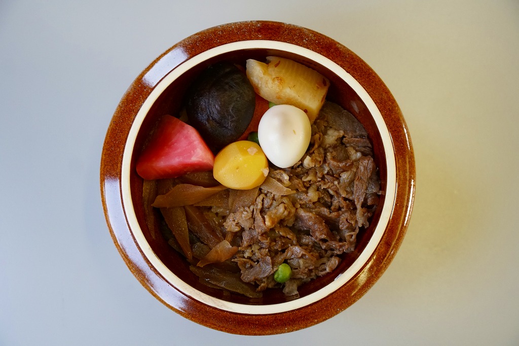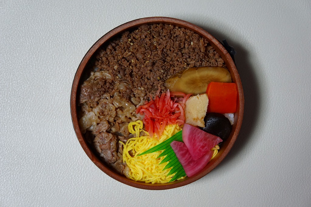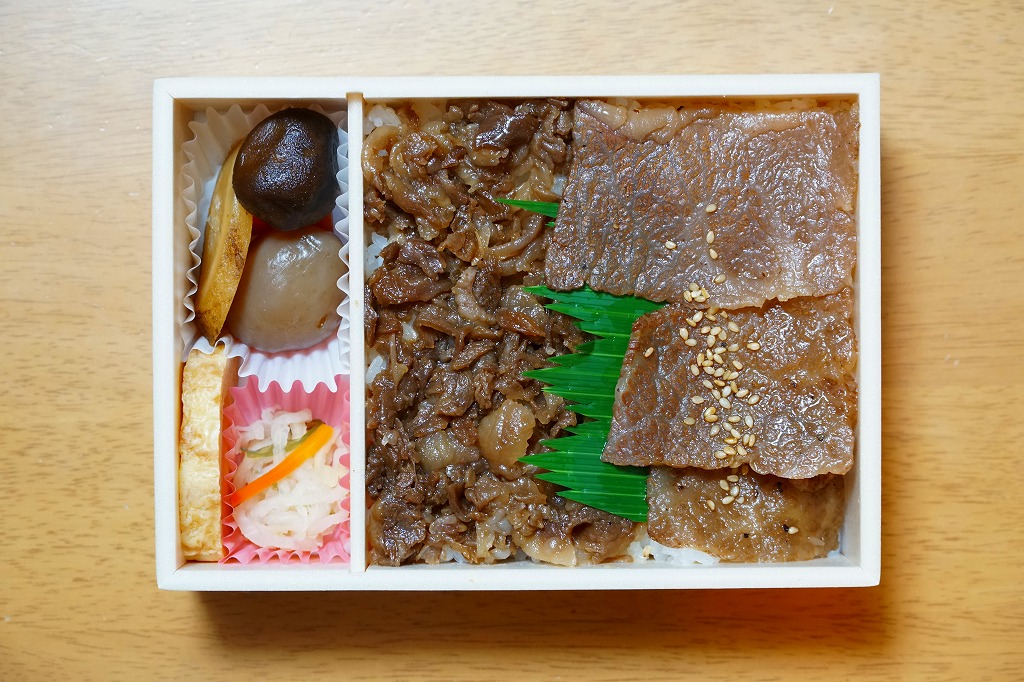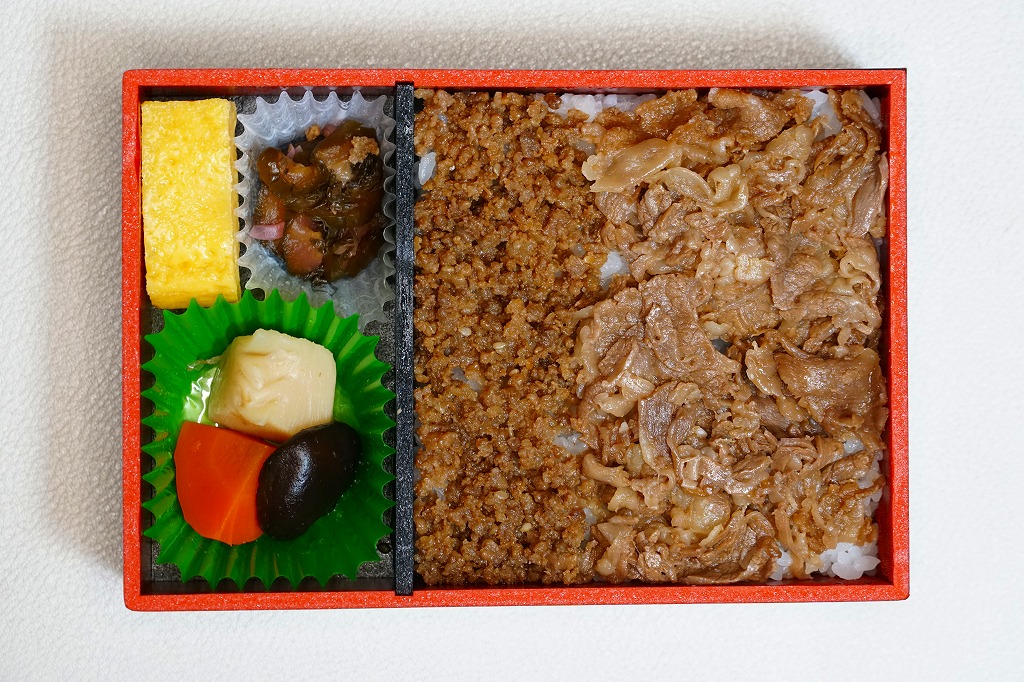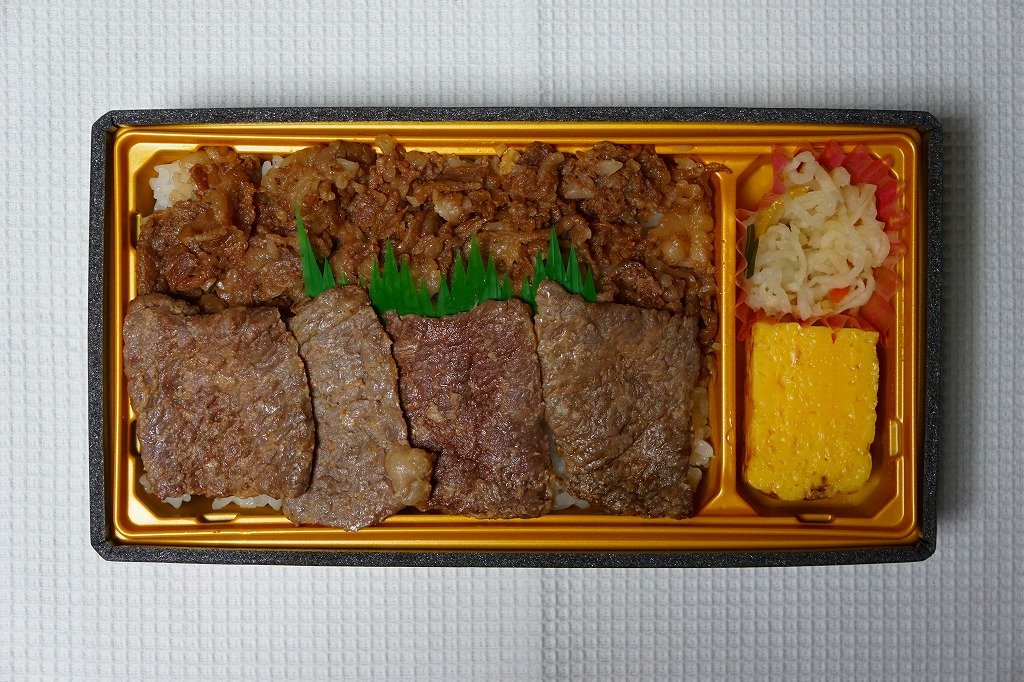 2023(令和5)年1月の京王百貨店の駅弁大会で実演販売。長方形のプラ容器に、白飯をローストビーフで覆いタレとネギを添えるローストビーフ丼と、白飯を牛肉煮で覆い煮玉子と煮物を添えるすき焼き重を詰めた。商品名と中身の写真を掲載した掛紙によると、そのいずれにも米沢牛を使うといい、薄めで霜降りの脂身ゆたかな肉が上品に思えた。1,980円という価格は、2010年代までであれば驚くべき高価格であったが、東京と催事の駅弁では見慣れつつある水準。