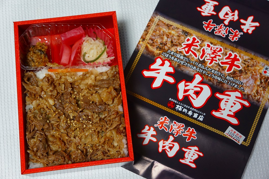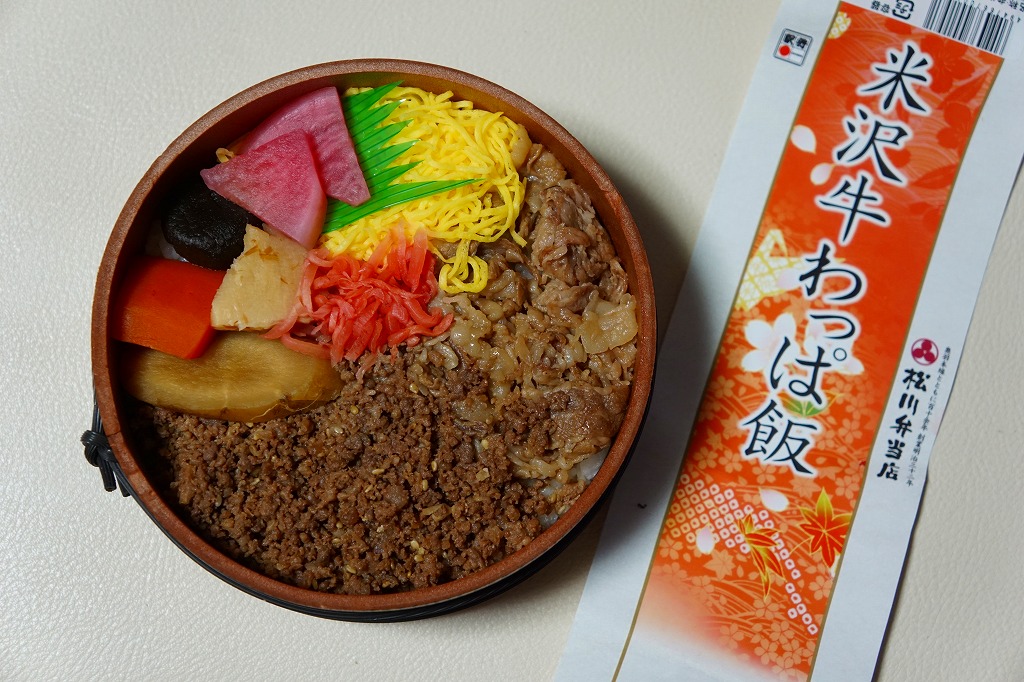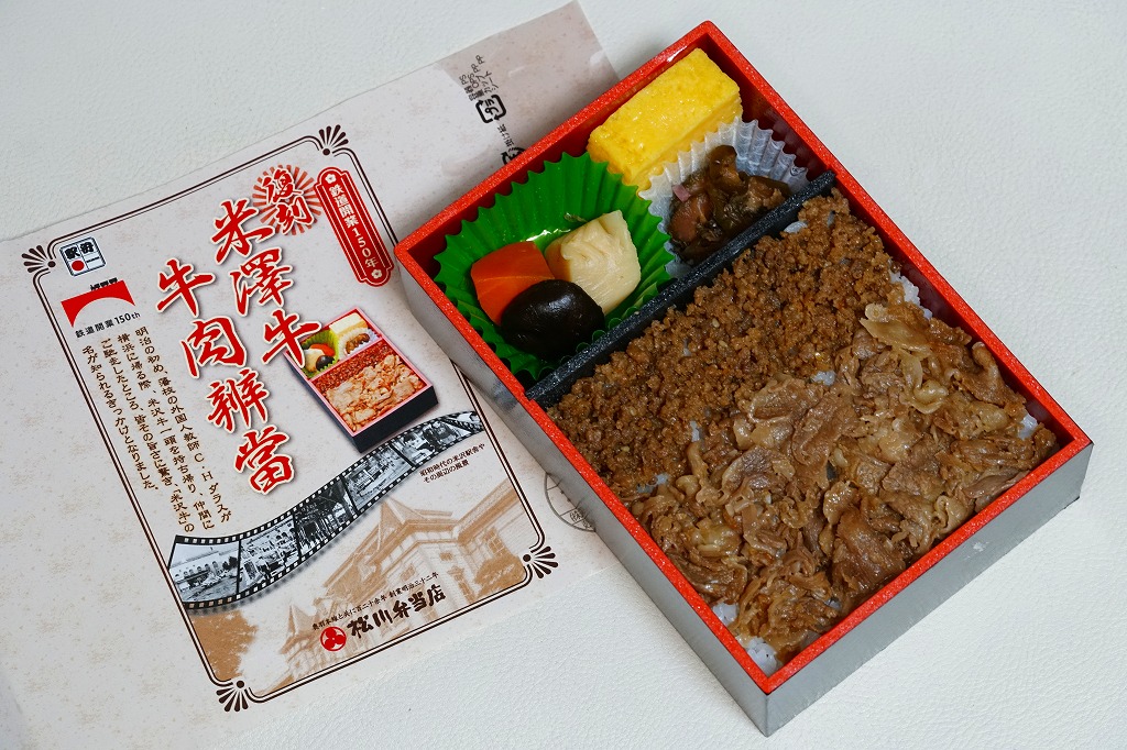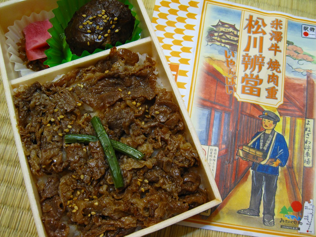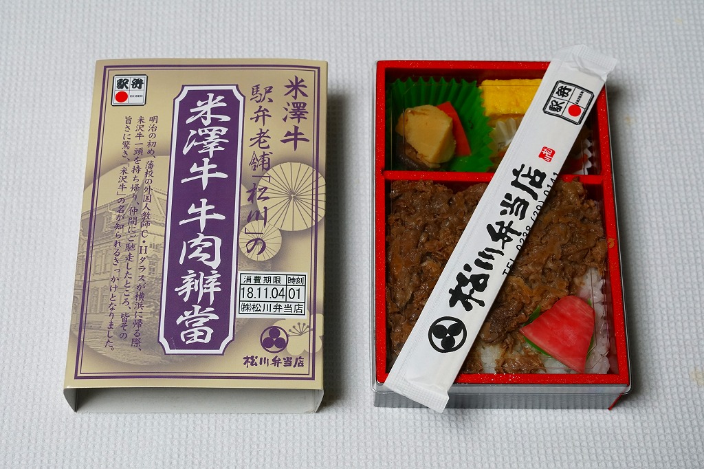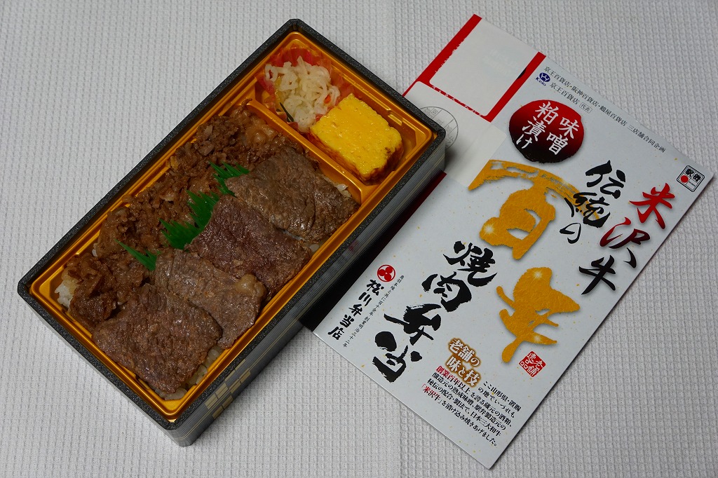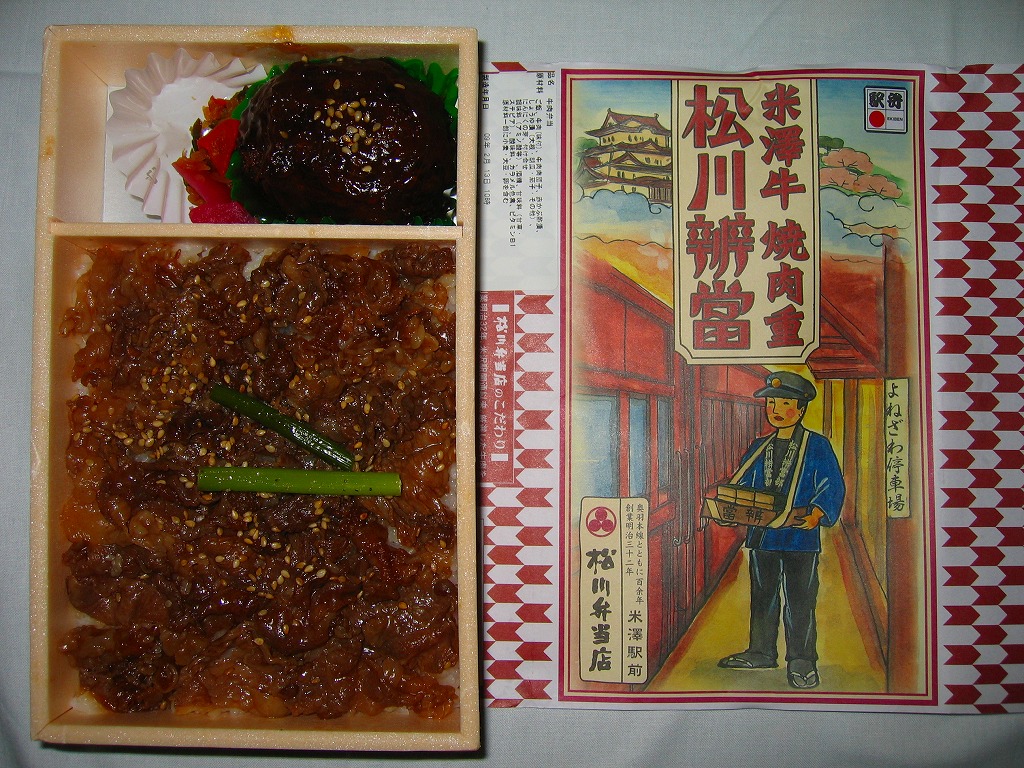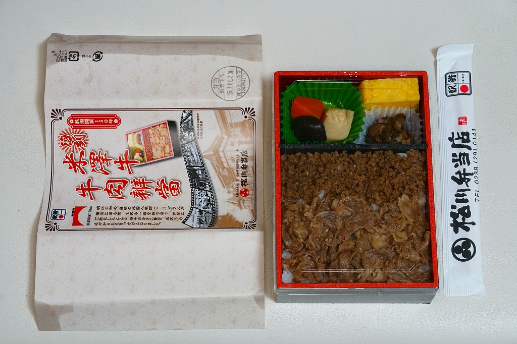 2009(平成21)年頃から存在していたか。2018年秋のJR東日本の駅弁キャンペーン「駅弁味の陣2018」にエントリー。白御飯を牛肉煮で覆い、煮物と玉子焼ときんぴらごぼうと大根漬を添える姿は、米沢や全国各地の牛肉駅弁と変わらない姿。この牛肉に米沢牛を使うのだろうか。味も中身もいつもの松川弁当店や牛肉駅弁に感じたが、薄手の牛肉は少し上質だったかも。価格は2010年時点で1,200円、2012年時点で1,250円、2017年時点で1,300円、2019年時点で1,350円、2023年時点で1,400円。