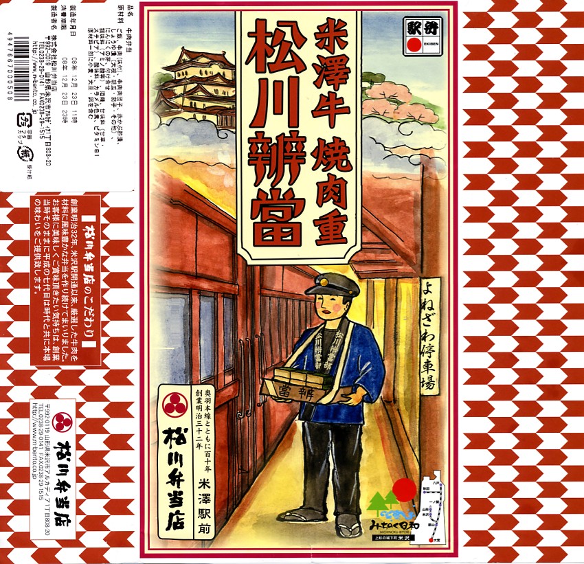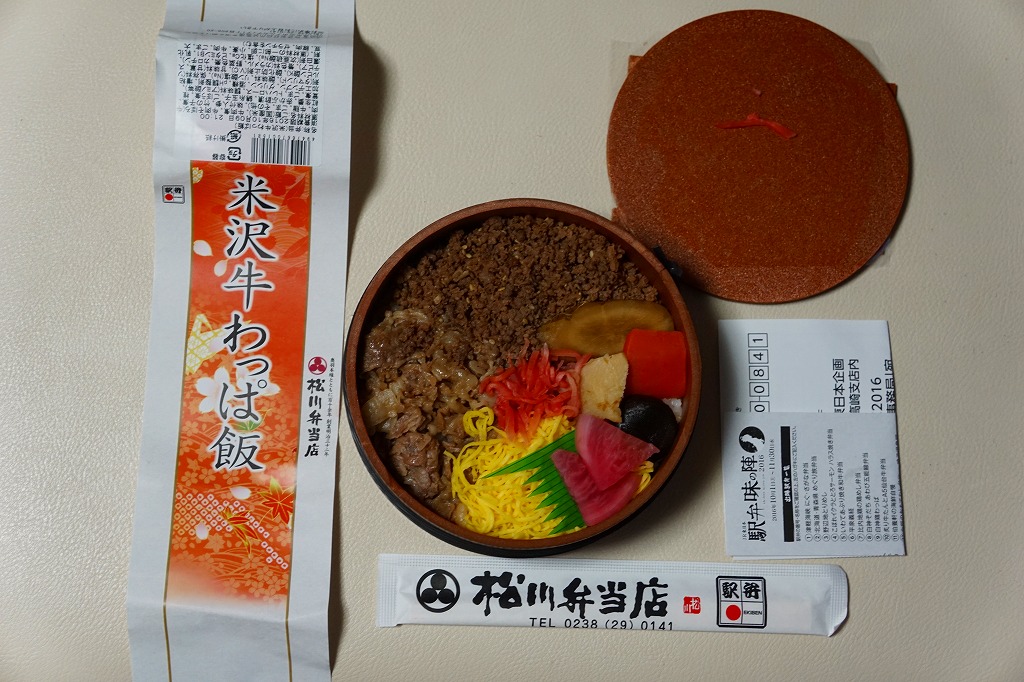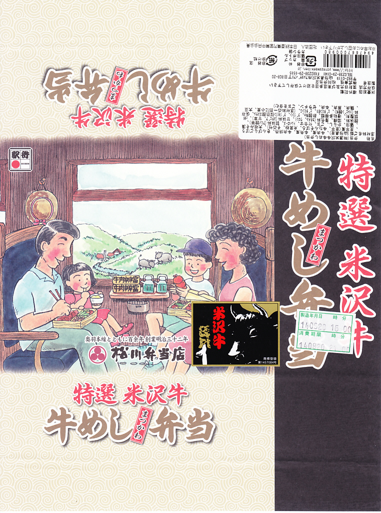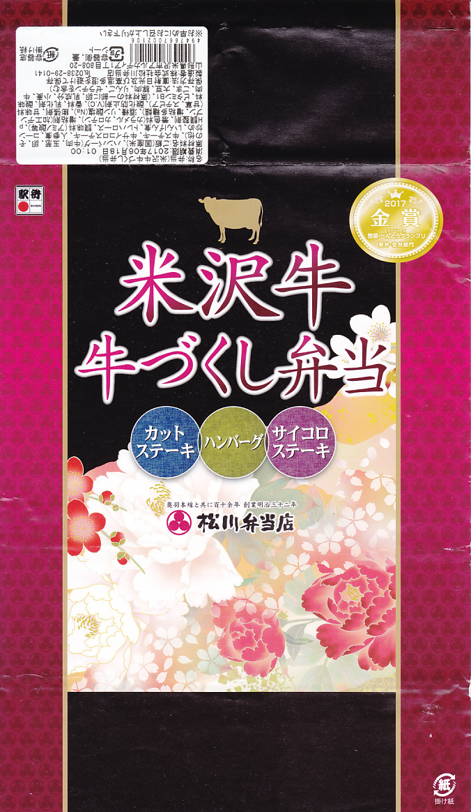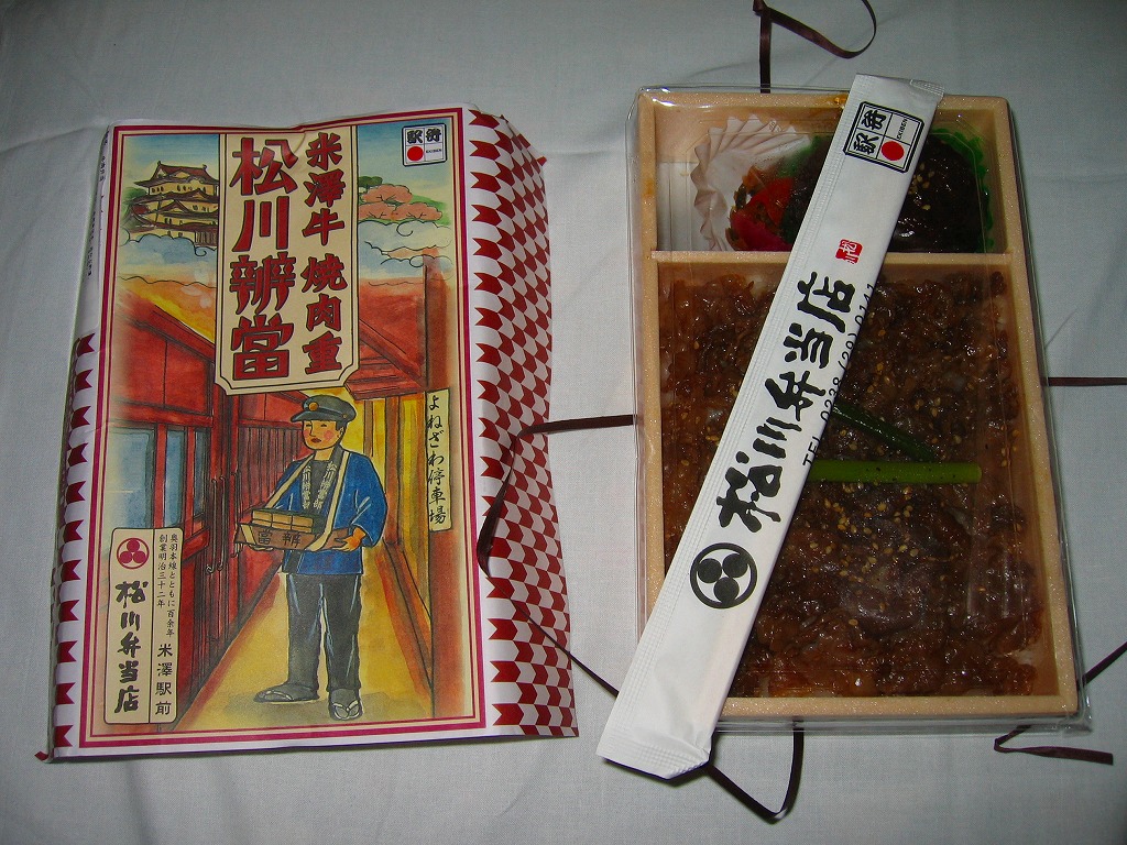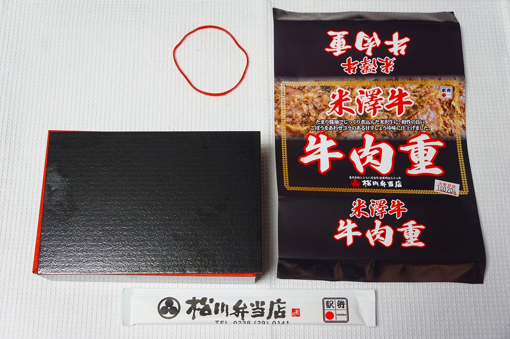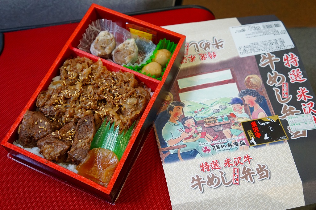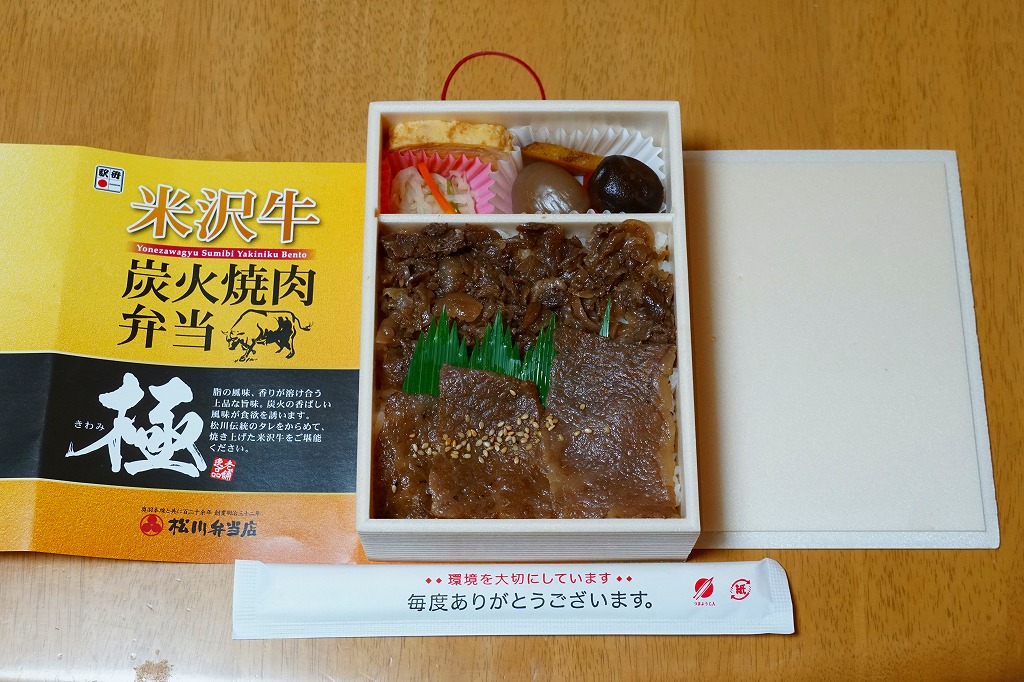 2009(平成21)年頃から存在していたか。2018年秋のJR東日本の駅弁キャンペーン「駅弁味の陣2018」にエントリー。白御飯を牛肉煮で覆い、煮物と玉子焼ときんぴらごぼうと大根漬を添える姿は、米沢や全国各地の牛肉駅弁と変わらない姿。この牛肉に米沢牛を使うのだろうか。味も中身もいつもの松川弁当店や牛肉駅弁に感じたが、薄手の牛肉は少し上質だったかも。価格は2010年時点で1,200円、2012年時点で1,250円、2017年時点で1,300円、2019年時点で1,350円、2023年時点で1,400円。