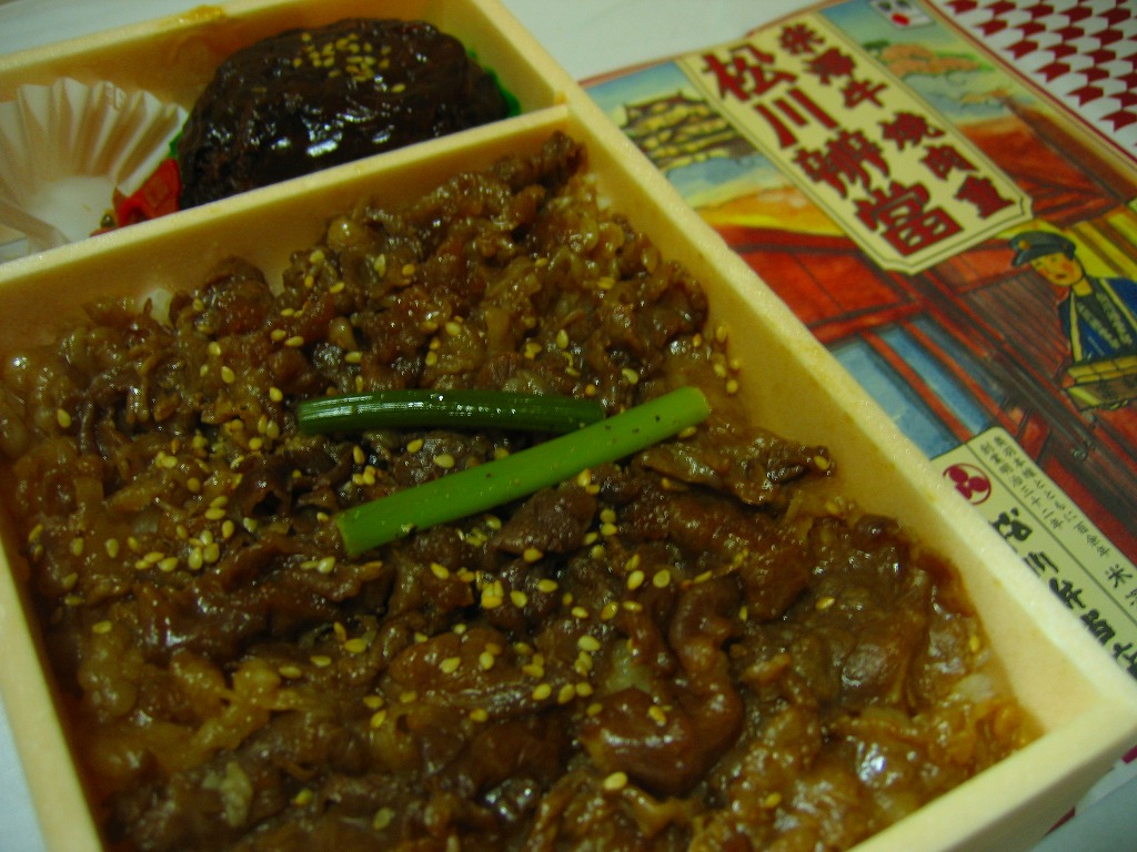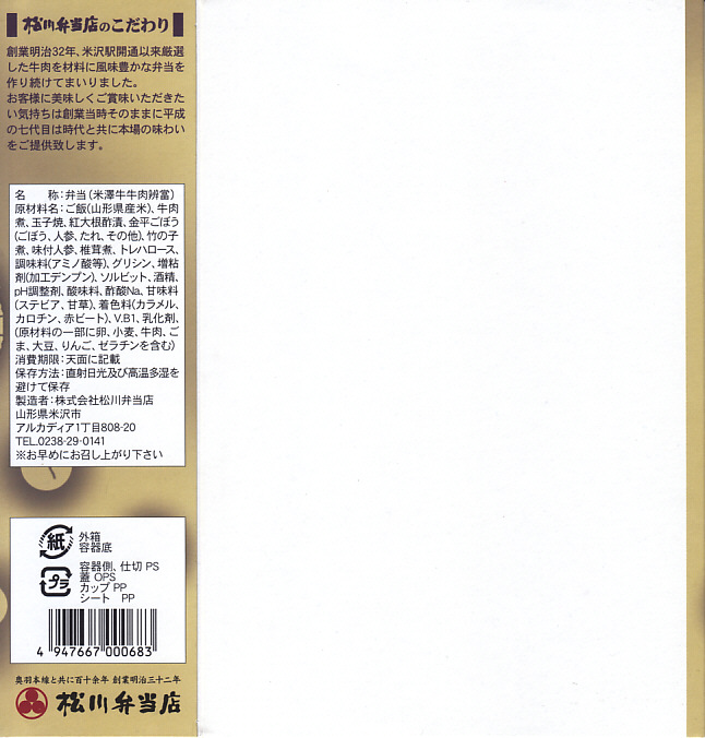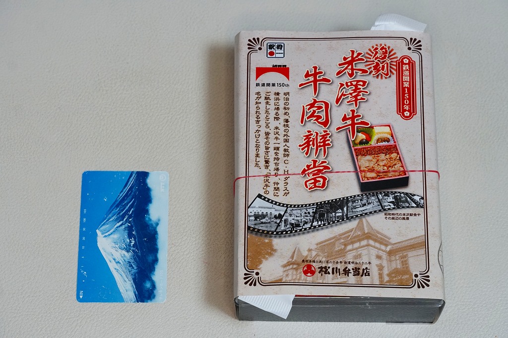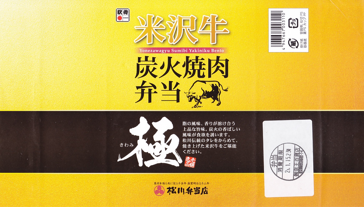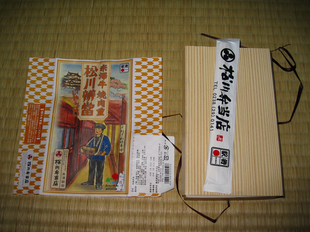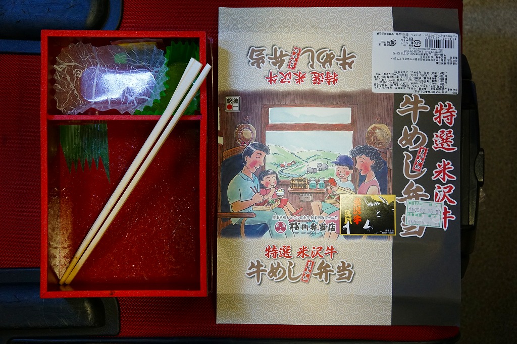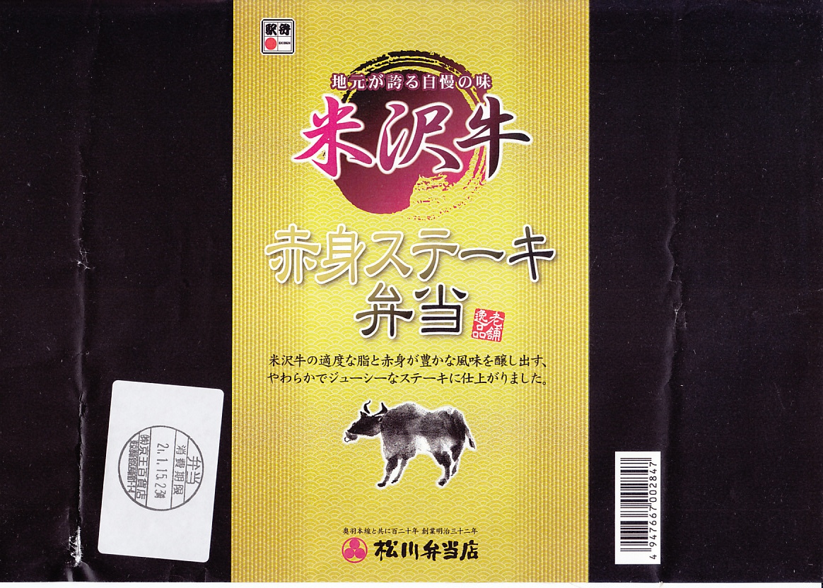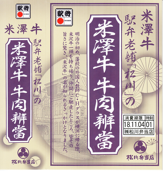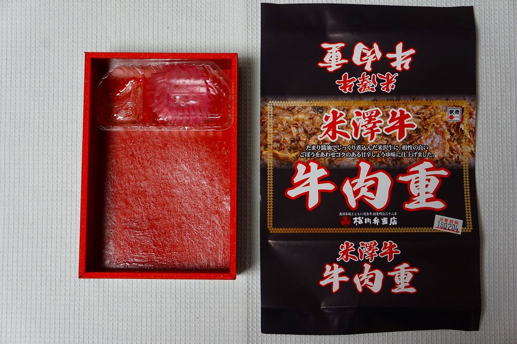 2009(平成21)年頃から存在していたか。2018年秋のJR東日本の駅弁キャンペーン「駅弁味の陣2018」にエントリー。白御飯を牛肉煮で覆い、煮物と玉子焼ときんぴらごぼうと大根漬を添える姿は、米沢や全国各地の牛肉駅弁と変わらない姿。この牛肉に米沢牛を使うのだろうか。味も中身もいつもの松川弁当店や牛肉駅弁に感じたが、薄手の牛肉は少し上質だったかも。価格は2010年時点で1,200円、2012年時点で1,250円、2017年時点で1,300円、2019年時点で1,350円、2023年時点で1,400円。