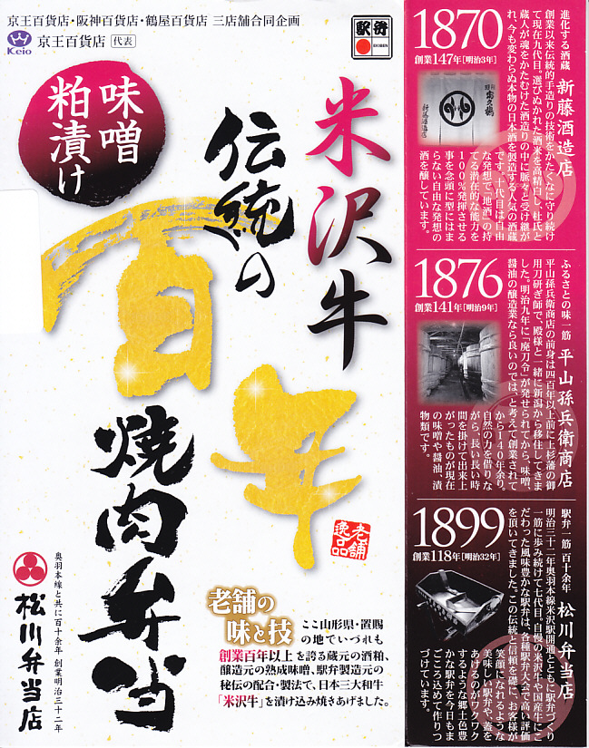 2018(平成30)年1月6日に京王百貨店の駅弁大会での実演販売でデビュー。東京の京王百貨店、大阪の阪神百貨店、熊本の鶴屋百貨店での駅弁大会を3大駅弁大会と定義し、「人気駅弁大会3店舗合同企画新作『牛肉』駅弁対決」として、京王百貨店代表でこの米沢駅弁「米沢牛伝統の百年焼肉弁当」、阪神百貨店代表で神戸駅弁「酒乃蔵牛肉弁当」、鶴屋百貨店代表で出水駅弁「熊本あか牛と鹿児島黒毛和牛の牛肉めし」を、これらの駅弁大会で同じ1,500円の価格で実演販売した。