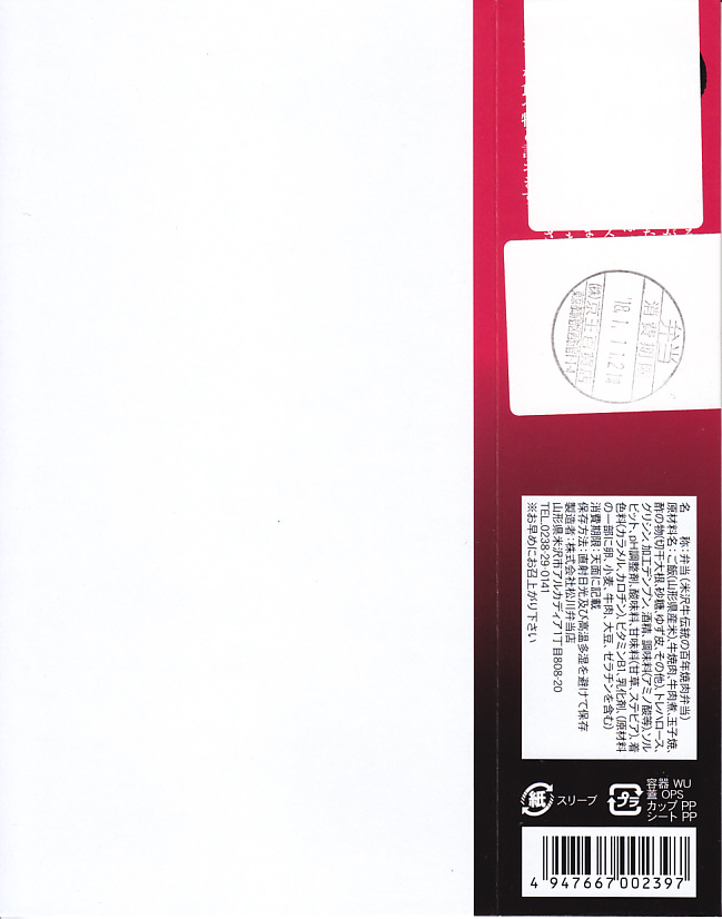 2021(令和3)年1月15日に購入した、米沢駅弁の掛紙。今回も京王百貨店の駅弁大会で購入。中身も値段も容器も、上記の前年と同じ。この年はスリーブでなく掛紙が使われた。