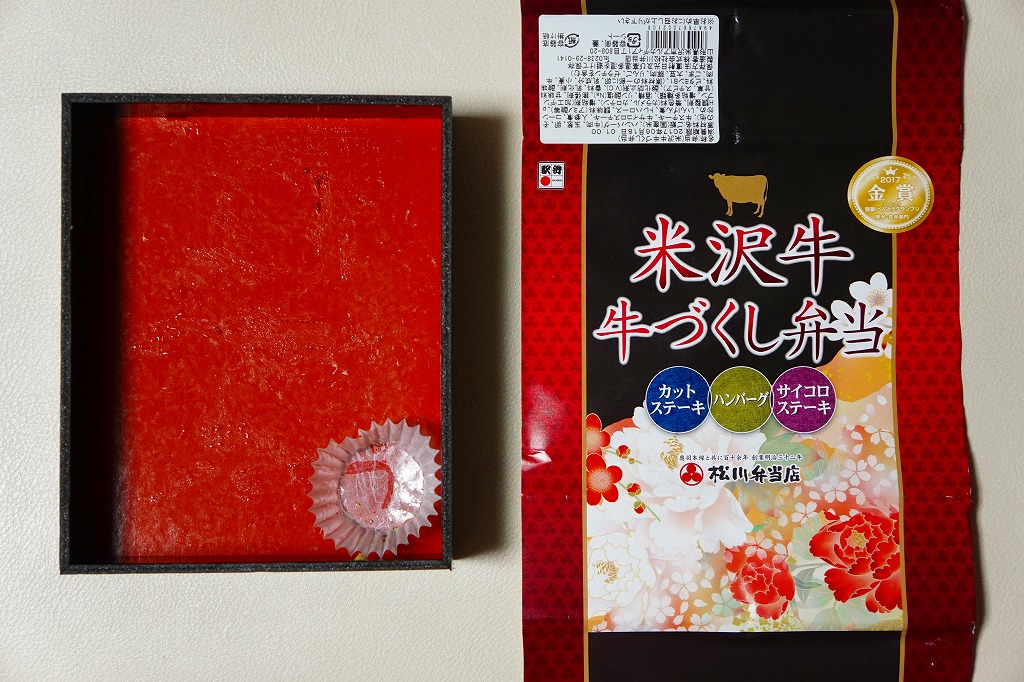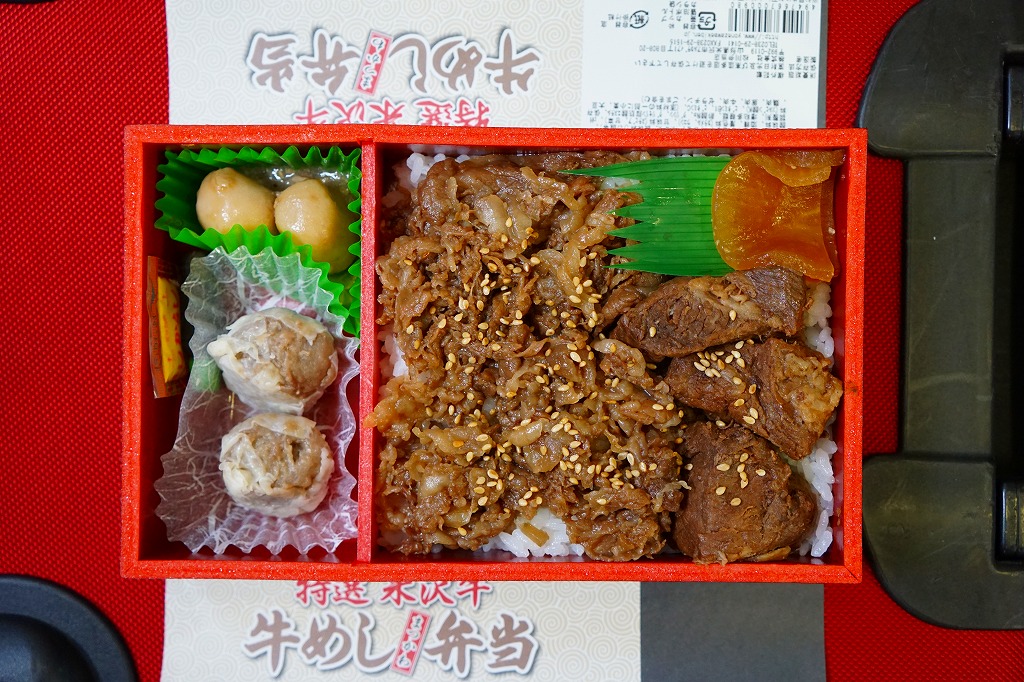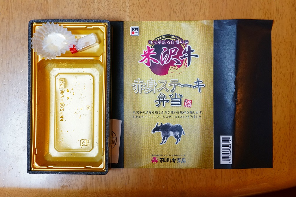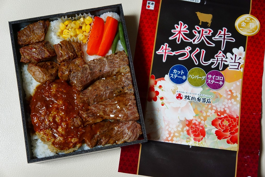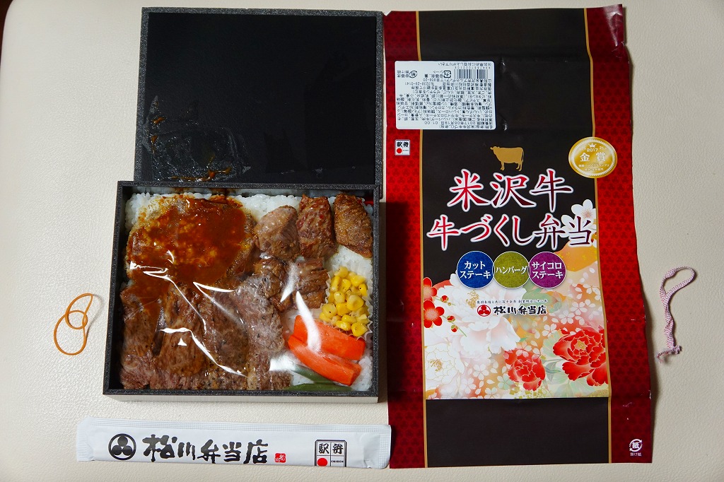真っ黒な容器に、白飯を薄く敷き、牛肉のカットステーキ、ハンバーグ、サイコロステーキで覆い、ニンジン、インゲン、コーンを添える。牛肉が実にたっぷり入る、ほぼ肉の駅弁。これらがすべて米沢牛とのことで、確かに7割は霜降り焼肉だったが、残る3割があごを鍛えるガチガチの硬い肉だったのは、仕様なのかどうか。2019年までの販売、2021年までの掲載か。