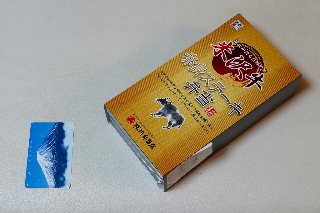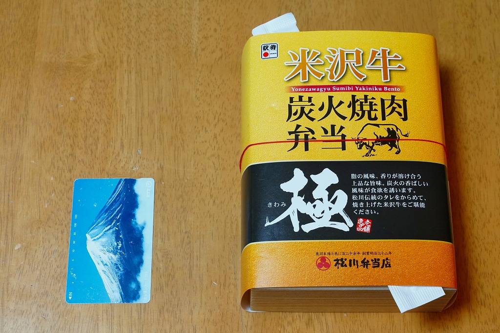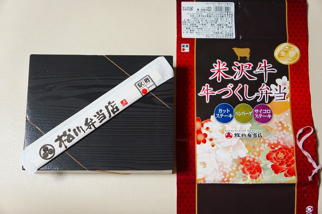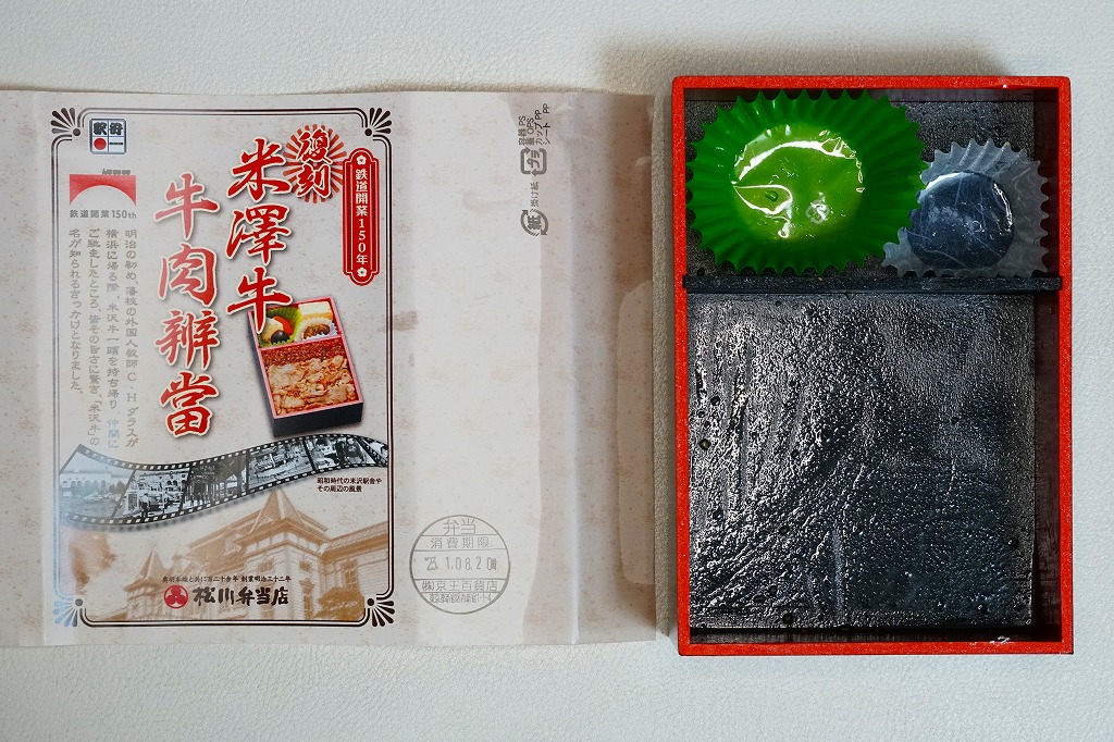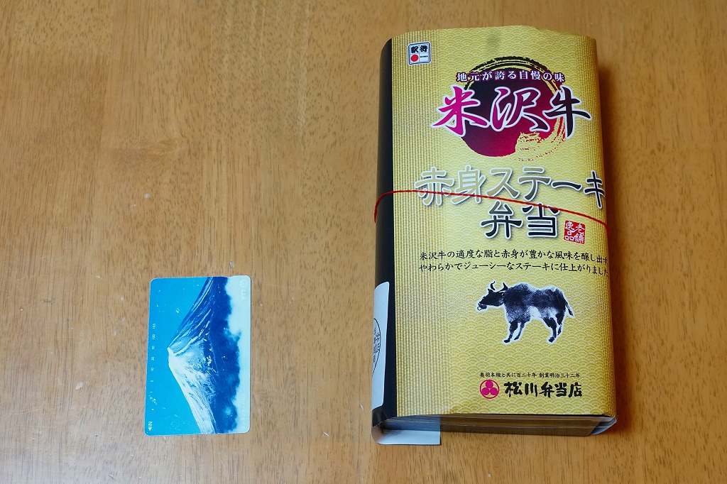 真っ黒な容器に、白飯を薄く敷き、牛肉のカットステーキ、ハンバーグ、サイコロステーキで覆い、ニンジン、インゲン、コーンを添える。牛肉が実にたっぷり入る、ほぼ肉の駅弁。これらがすべて米沢牛とのことで、確かに7割は霜降り焼肉だったが、残る3割があごを鍛えるガチガチの硬い肉だったのは、仕様なのかどうか。2019年までの販売、2021年までの掲載か。