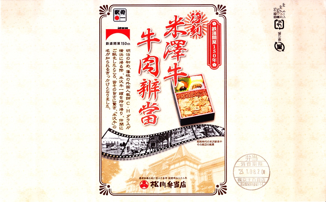 2022(令和4)年10月1日に米沢駅などで発売、翌2023年3月31日まで販売。日本鉄道構内営業中央会の鉄道開業150年記念復刻駅弁企画により、同月から期間限定で販売された31社34駅弁のひとつ。レトロなデザインと名乗る掛紙には、昭和時代の米沢駅舎やその周辺の風景写真に中身の写真、鉄道開業150年のロゴマークなどがみえる。