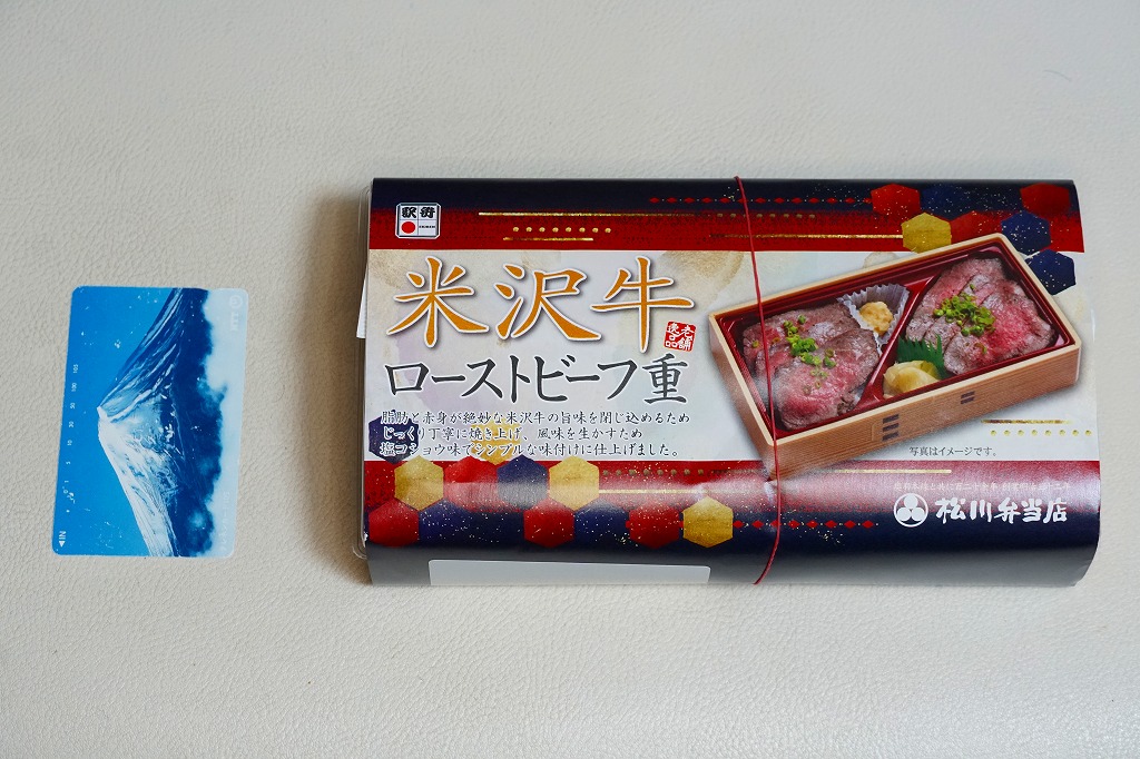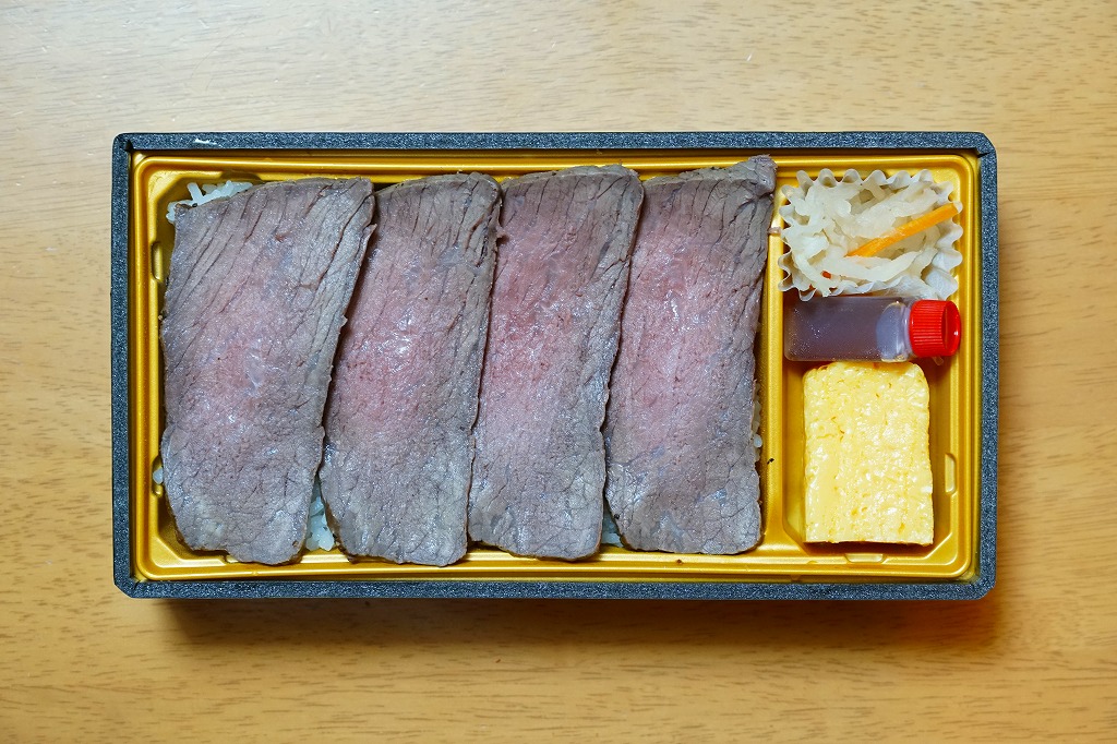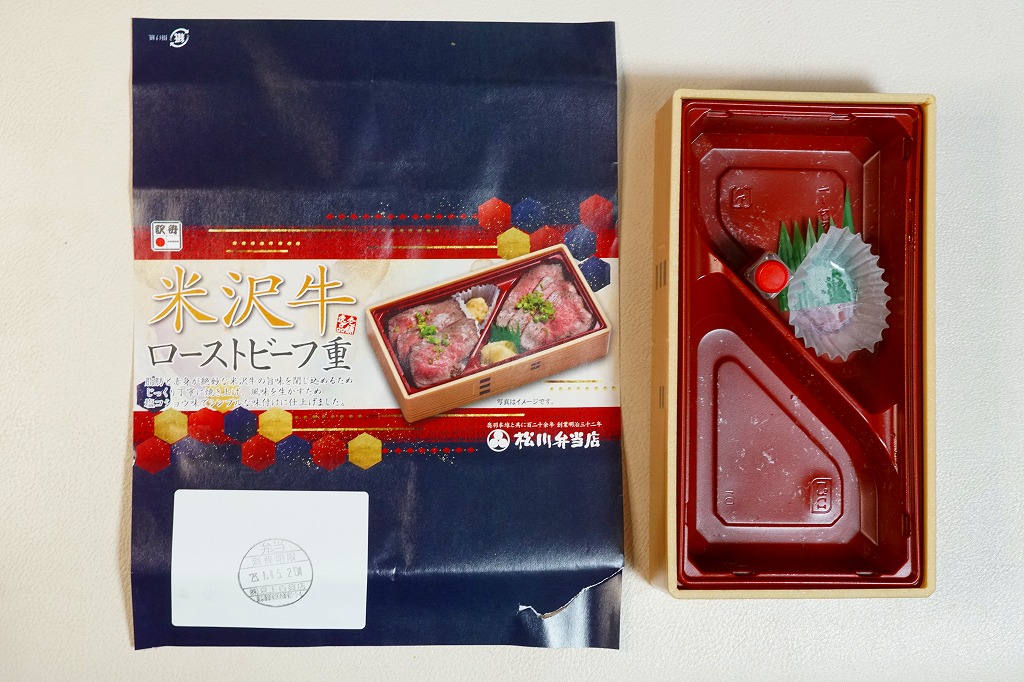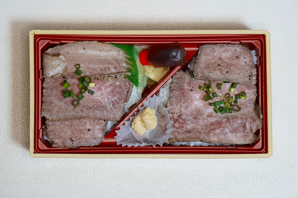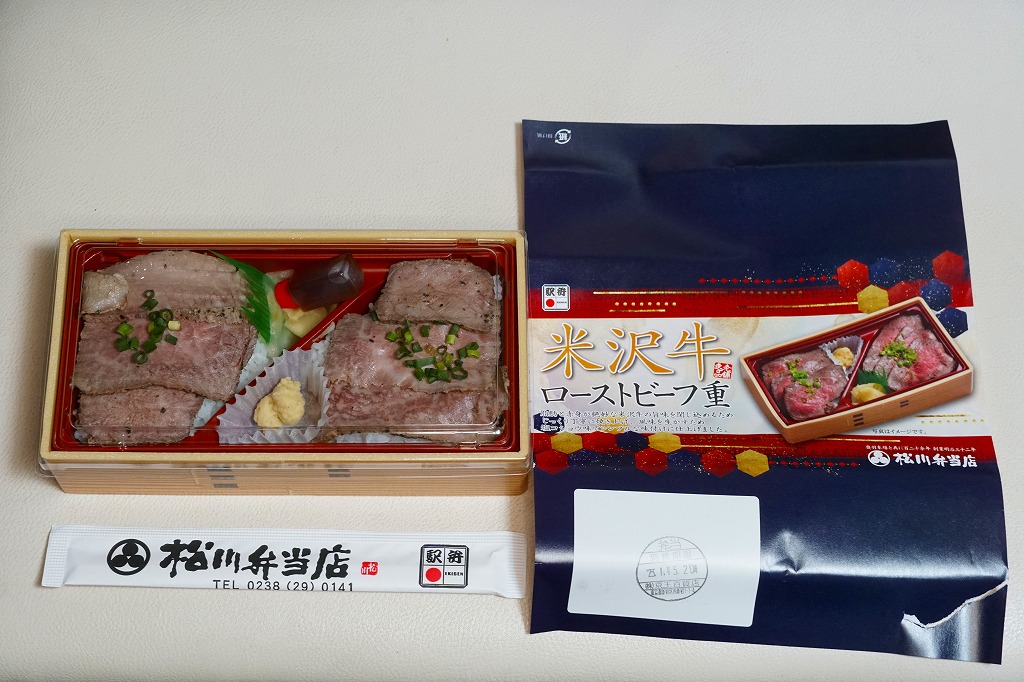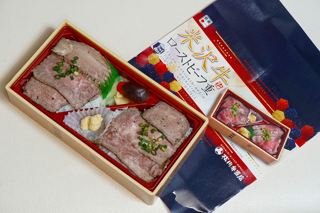 2023(令和5)年1月の京王百貨店の駅弁大会で実演販売。長方形のプラ容器の両区画に白飯を詰め、どちらもローストビーフで覆い、ネギとタレとガリを添える。商品名と中身の写真を掲載した掛紙によると米沢牛を使うといい、薄めで霜降りの脂身ゆたかな肉が上品に思えた。2,300円という価格は、2010年代までであれば驚くべき高価格であったが、駅弁催事で実演販売する牛肉駅弁では見慣れつつある水準。