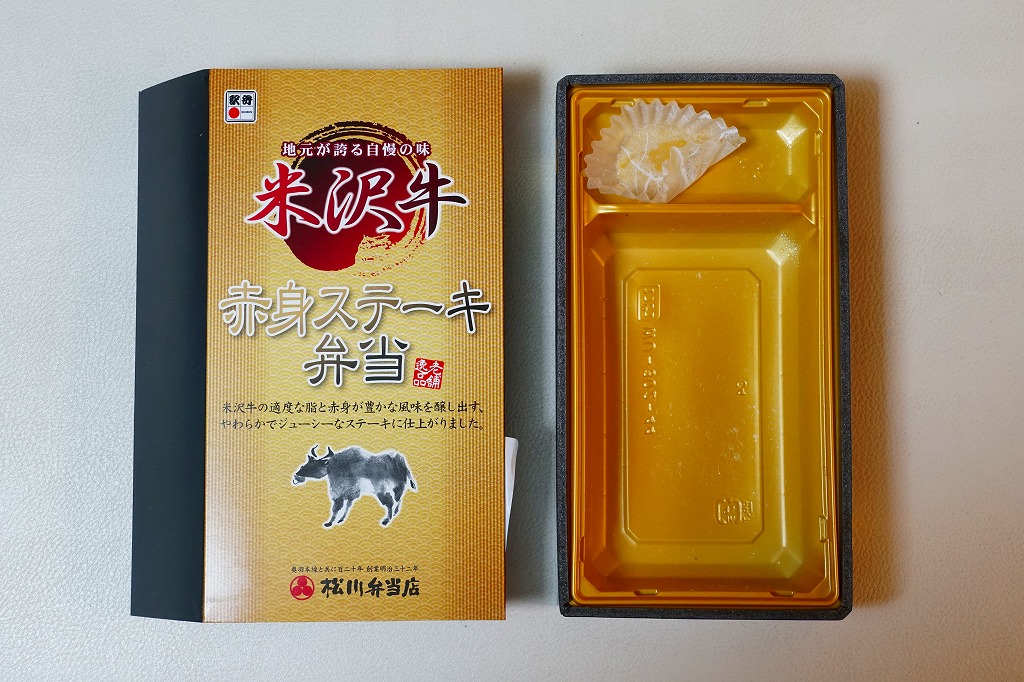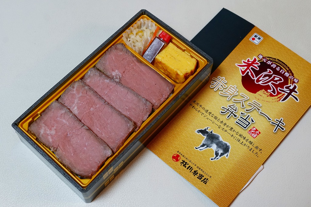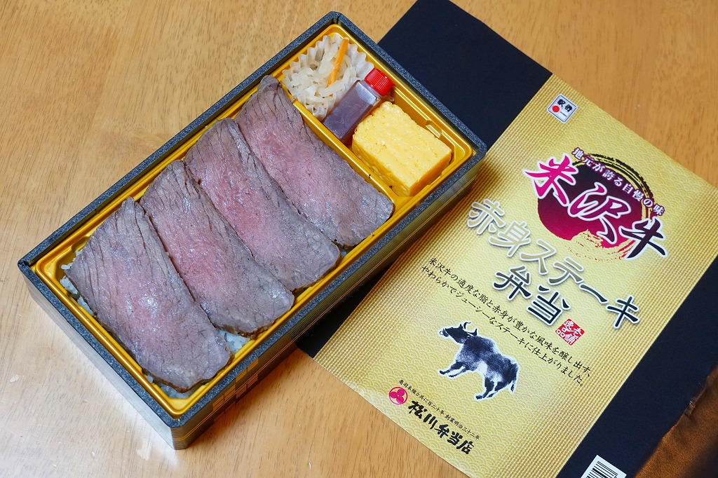 2020(令和2)年1月の京王百貨店の駅弁大会で実演販売。白御飯を米沢牛の、ステーキというよりはローストビーフのようなものできれいに覆い尽くし、タレと玉子焼と切り干し大根を添える。「赤身」を名乗るだけあり、ブランド牛の宣伝文句に違い、脂が控えめですっきりしていた。とても高価だが、大都会での駅弁祭りにあってよい商品。しかし京王百貨店の駅弁大会以外では売られなかった模様。