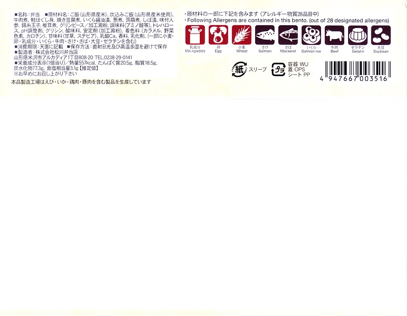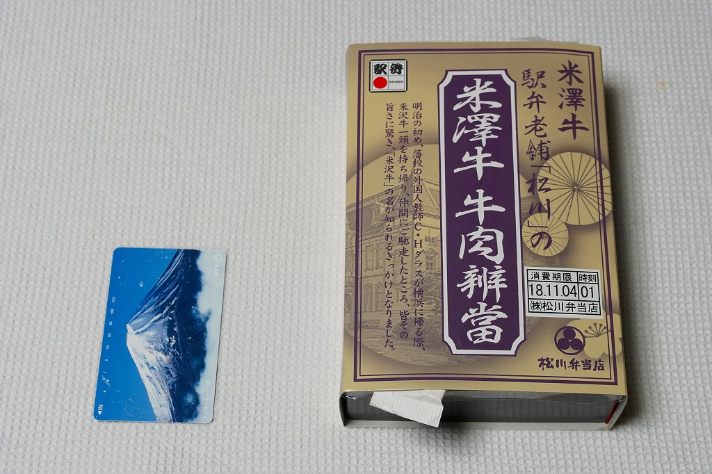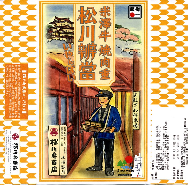 調製元公式サイトと販売箇所では米沢の駅弁を名乗り、実際は東京駅でしか販売されていない点では、また新たな疑義駅弁が出てきた感じ。しかし商品そのものに駅名はなく、市販の時刻表でも東京駅弁の扱いであり、東京駅では普通に販売されているのだから、駅弁であることに間違いはなさそう。2012年までの販売か。