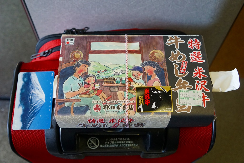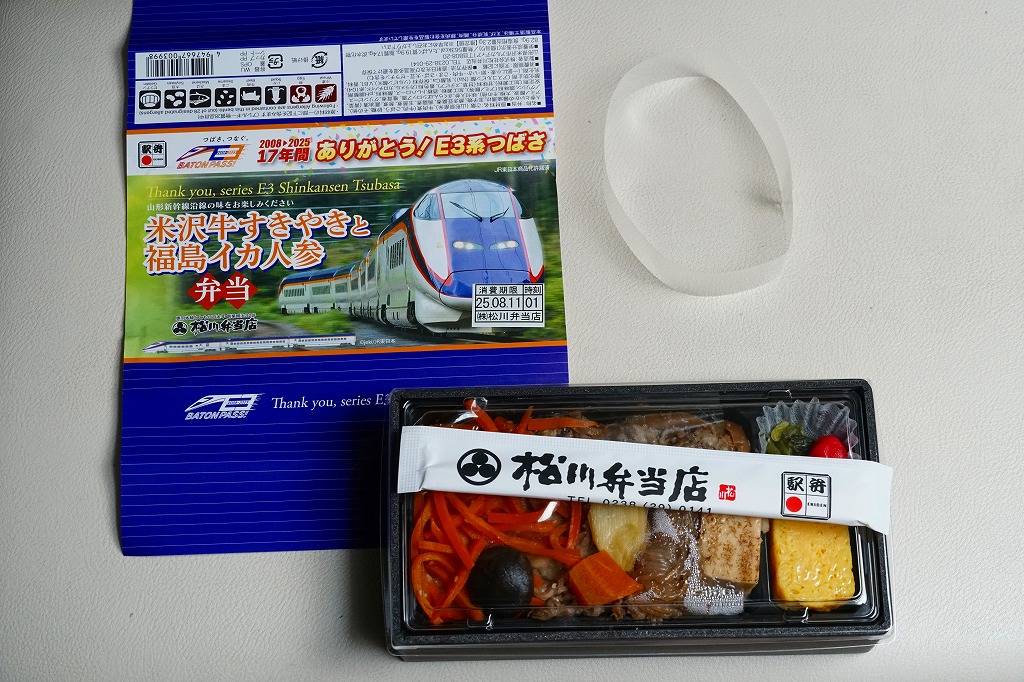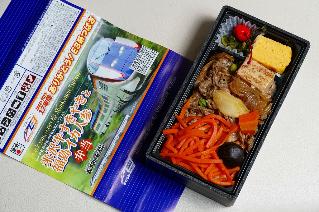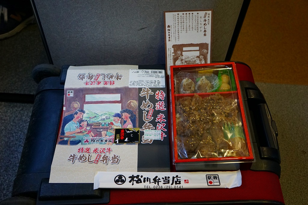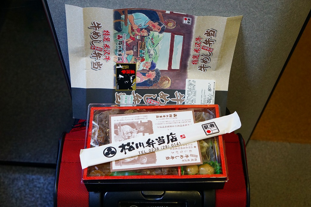 長方形のプラ容器に、山形県産米はえぬきの白飯を詰め、米沢牛とタマネギの炒め物と、福島県中通りの郷土料理という「いかにんじん」なるニンジンの千切りの炒め物で覆い、玉子焼、おみづけ、さくらんぼを添える。ただの牛肉駅弁、ブランド牛で高価な駅弁に見えて、山形に少し福島を足して、記念の趣旨が表現されている。9月以降、第2弾、第3弾の記念駅弁の発売が予定されるという。