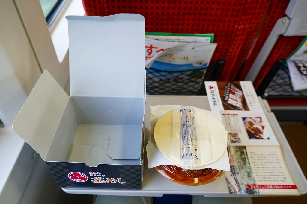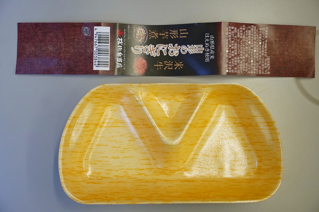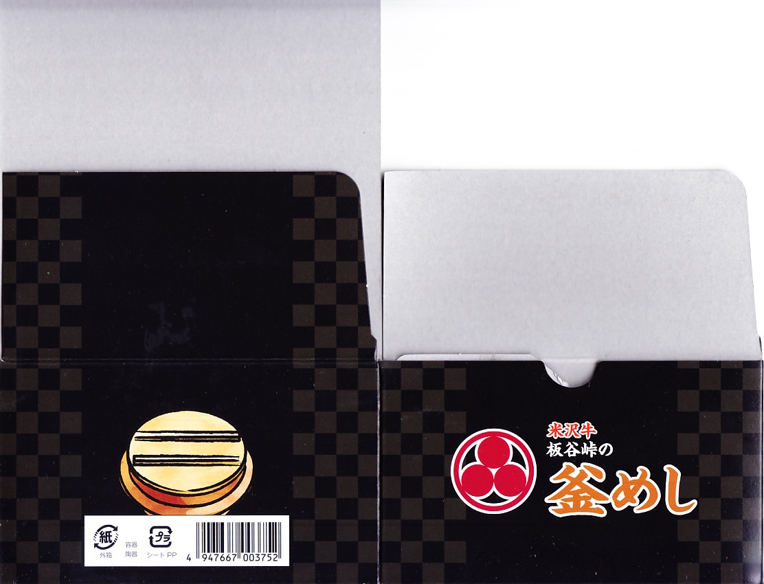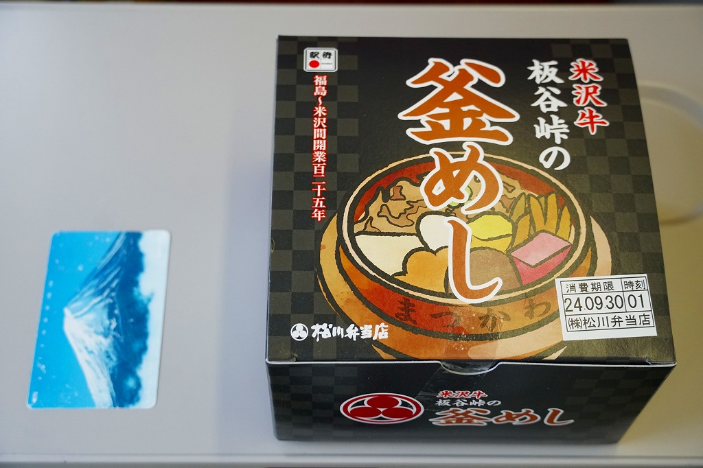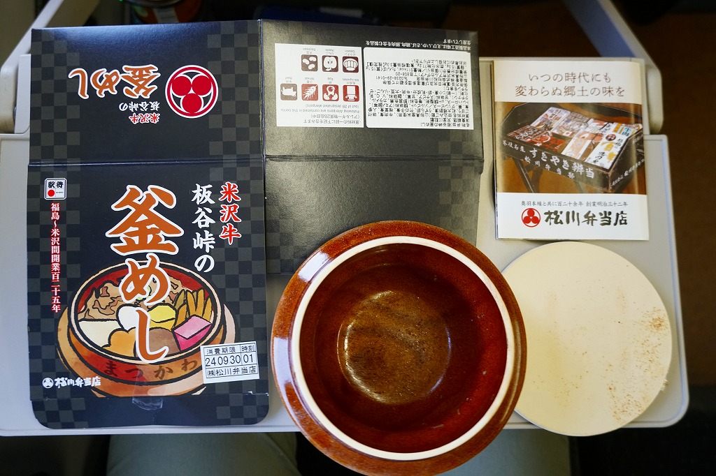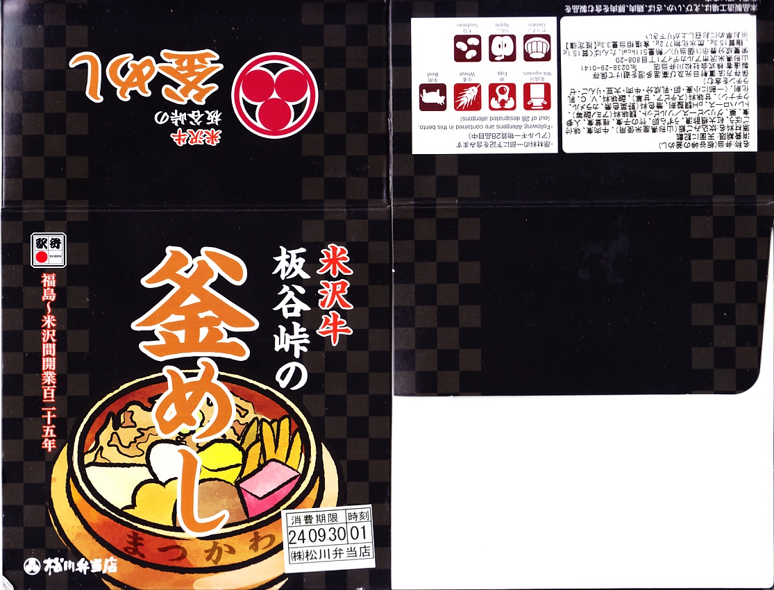 2024(令和6)年5月に米沢駅でなく、仙台駅やスーパーなどの駅弁催事で発売か。この商品名では、横川駅の名駅弁「峠の釜めし」のパクリと見られて仕方ない。しかもその元祖と同じように、ふたの中央と釜の側面に駅名や商品名や調製元の名を入れてきた。あちらは掛紙でこちらは紙箱なので、区別はできる。