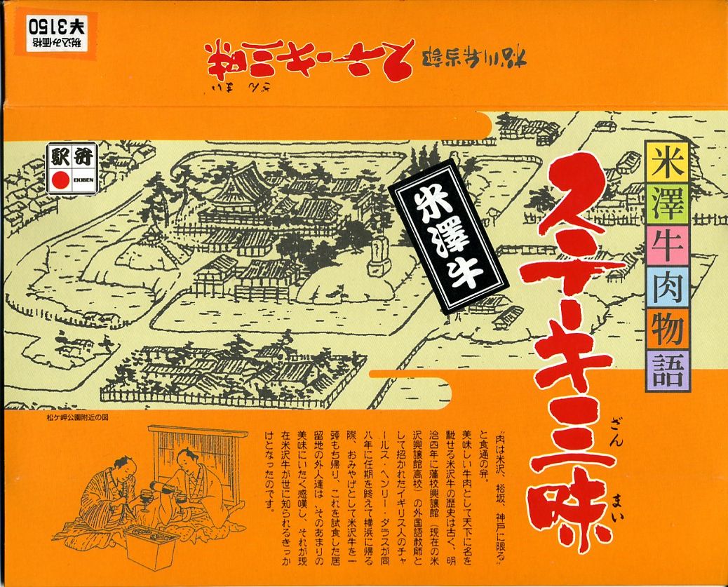2011(平成23)年秋の新作か。米沢駅弁に多数ある、飯と肉と付合せの組合せ。商品名と肉の写真で構成する黒い掛紙に包まれた発泡材の容器に、白飯を詰め、牛肉煮で覆い、味噌やダイコンを添える。見た目も内容も、「たまり醤油でじっくり煮込んだ米沢牛」の味も、今は普通の牛肉駅弁。価格は2012年時点で1,150円、2014年時点で1,200円、2017年時点で1,250円、2018年の購入時で1,300円、2020年時点で1,350円、2023年時点で1,380円。