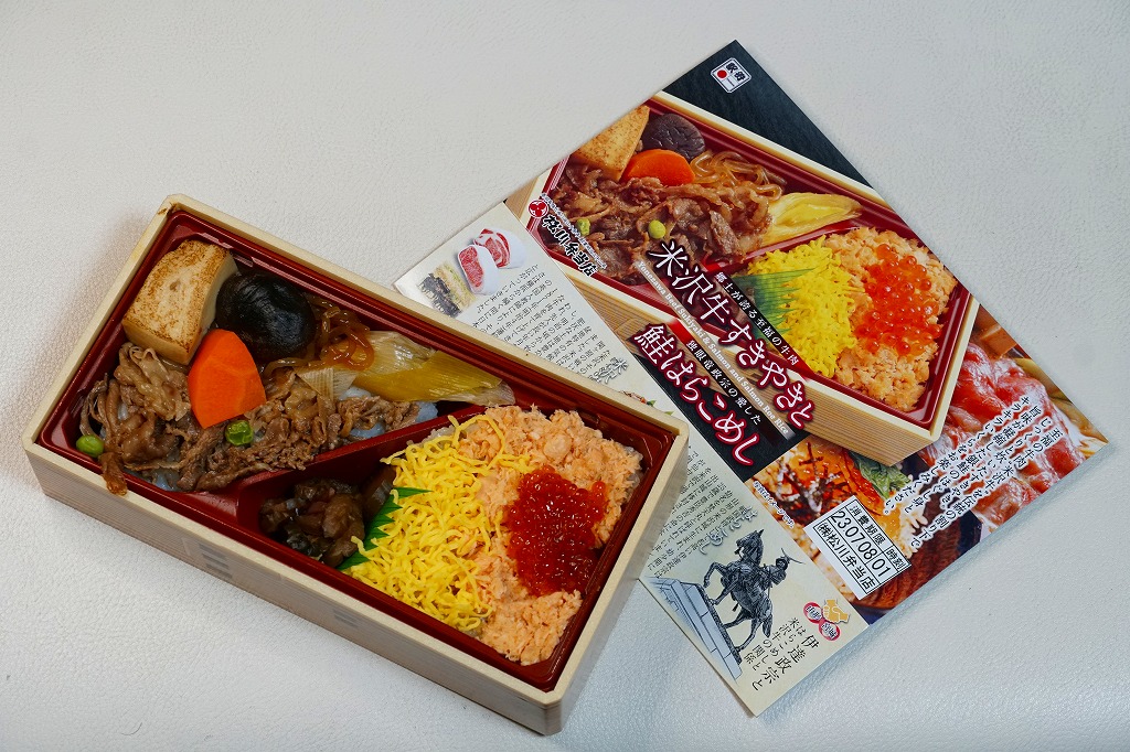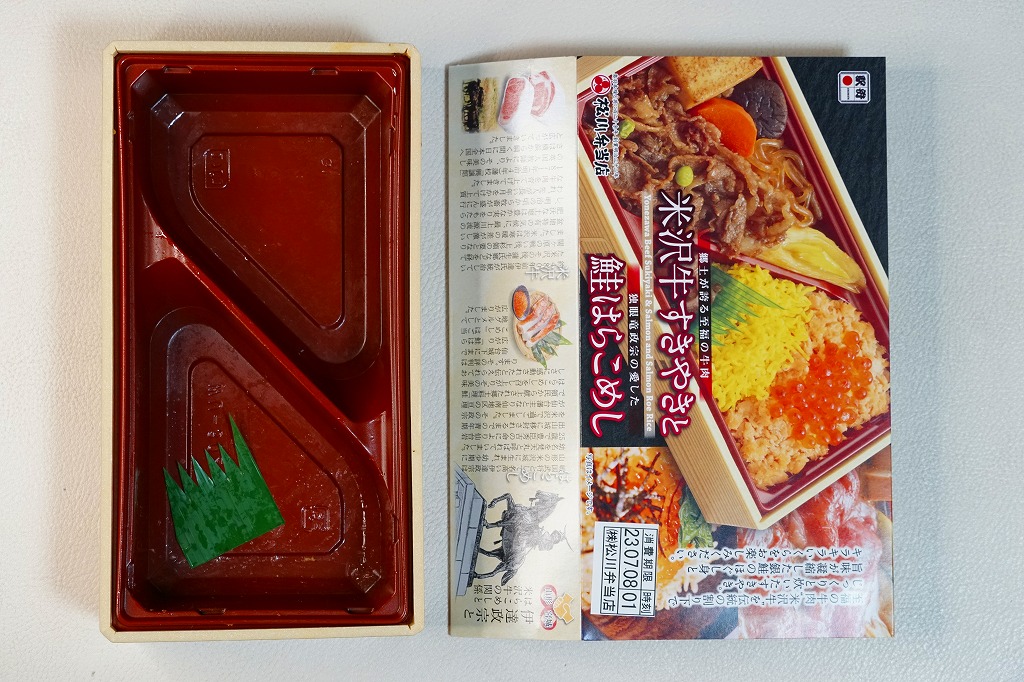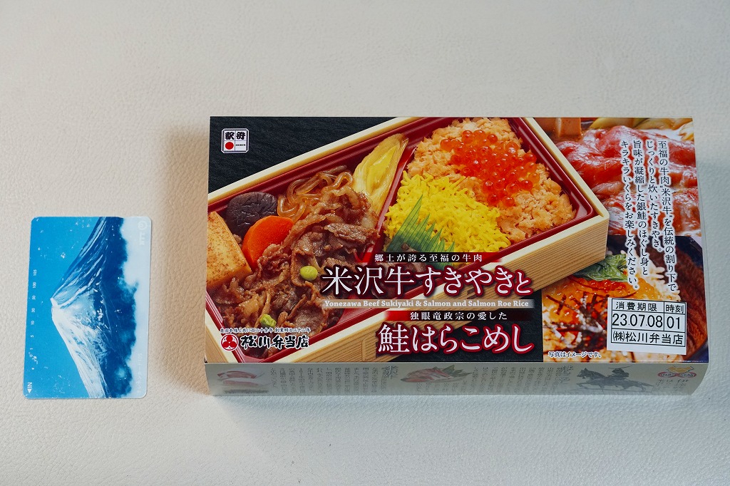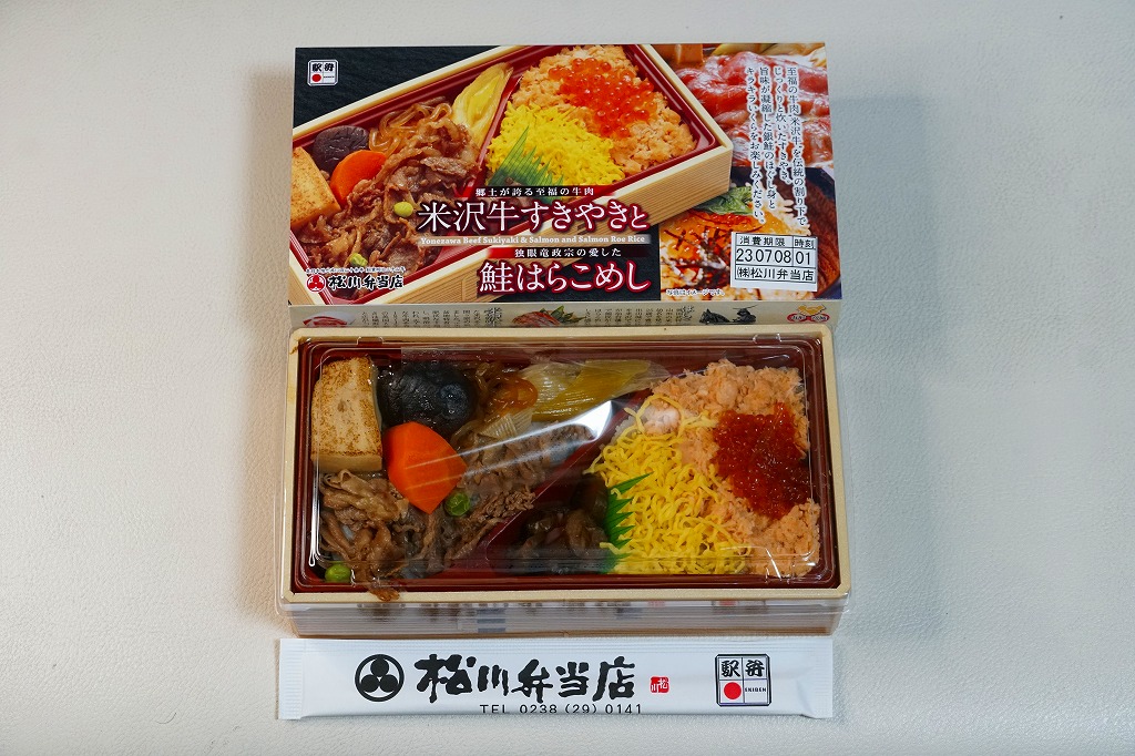 2023(令和5)年の7月までに、東京駅や仙台駅で発売か。調製元が米沢駅の駅弁屋なので、ここに収蔵するが、米沢駅で予約や注文をせずに買えることは、おそらくないだろう。スリーブで中身の美しい写真とともに記した駅弁の名前には、「郷土が誇る至福の牛肉」米沢牛すきやき、「独眼竜政宗の愛した」鮭はらこめしという接頭辞が付き、「伊達政宗とはらこめしと米沢牛の関係」と題した、しかしさすがに伊達政宗とそれらは関係ないように見えるコラムを記す。