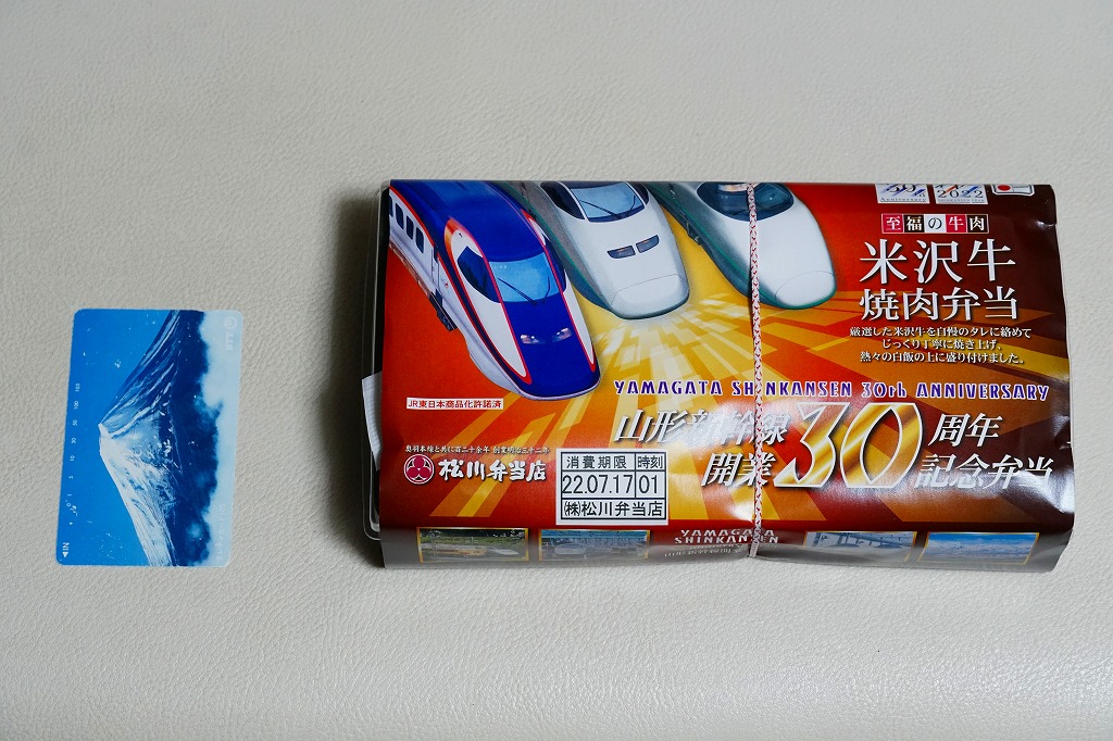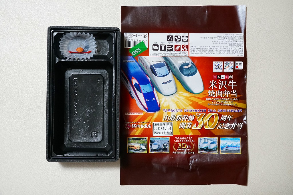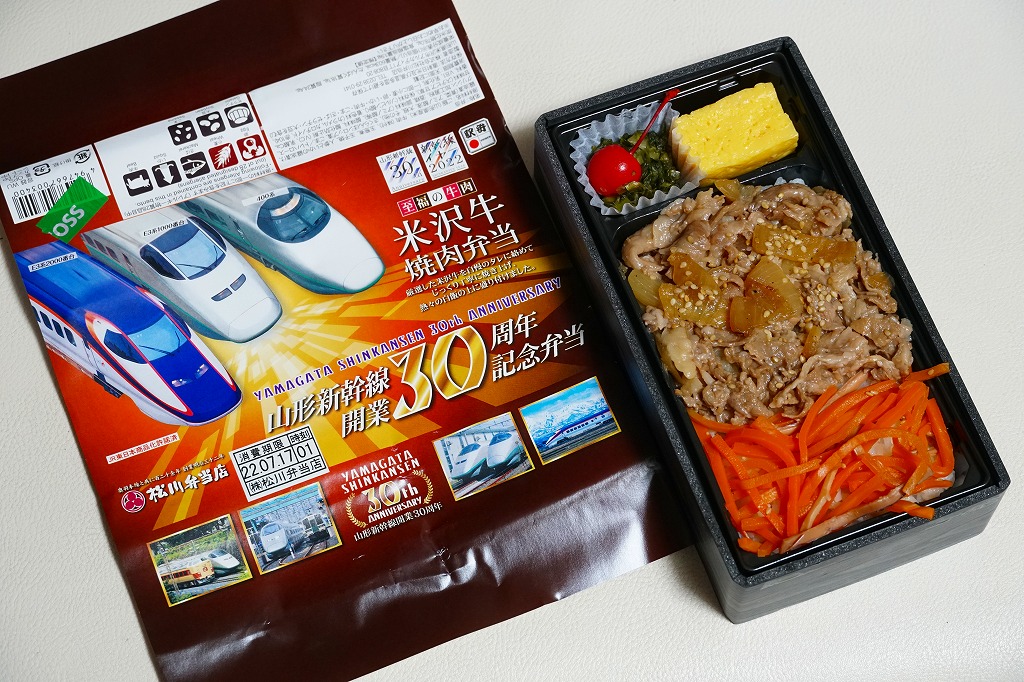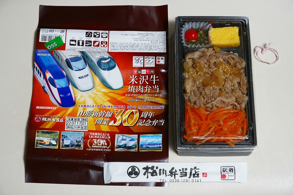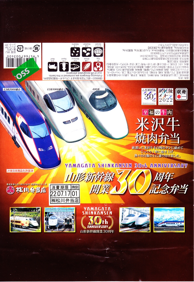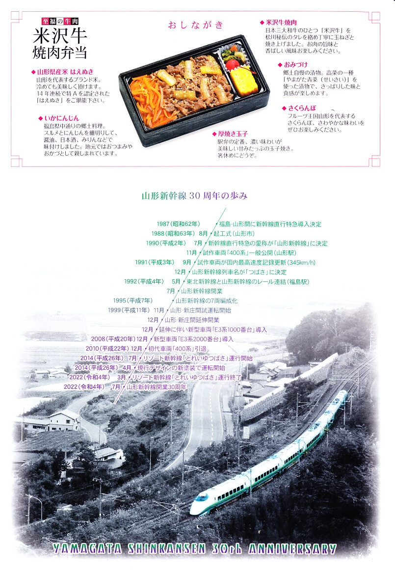 2021(令和3)年7月1日に発売、8月31日までの販売。米沢駅では要予約といい、東京駅などの首都圏各駅と、仙台駅、山形駅、新庄駅、福島駅で売られるそうな。過去の山形駅弁「米沢牛焼肉弁当」とのつながりはないと思われる、山形新幹線開業30周年記念駅弁。掛紙の表面には歴代の山形新幹線電車3種類のイラストを描き、裏面にはおしながきと山形新幹線の歴史を記す。