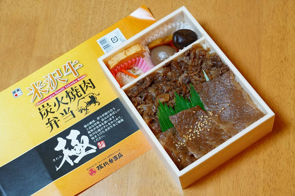 白御飯を米沢牛の牛焼肉と牛肉煮で覆い、ダイコンの酢の物と玉子焼を添える。新藤酒造店の酒粕と平山孫兵衛商店の味噌で米沢牛を漬け込み焼いたというが、味はまあいつもの東京駅の駅弁売店「駅弁屋 祭」の松川弁当店の牛肉駅弁と同じ。普通にうまい牛肉駅弁というか、これだけ宣伝で煽るのに物足りないと思うか。価格は2018年の発売時や購入時で1,500円、2022年時点で1,600円、2023年時点で1,650円。