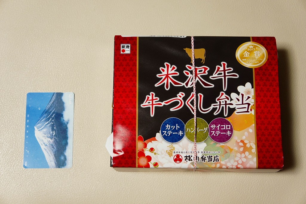 2010(平成22)年より以前に発売か。もはや東京駅やスーパーやデパートなど、米沢駅でない場所で売られるようになった米沢の牛肉弁当だが、これは主に米沢駅で売られる牛肉駅弁と考えられる。四角い容器に白飯を詰め、牛肉煮と牛角煮で覆い、牛肉焼売2個とサトイモ煮などを添える。たしかに牛づくし。米沢でない場所で買える米沢駅弁と内容が被ってはいる。2017年までの販売か。