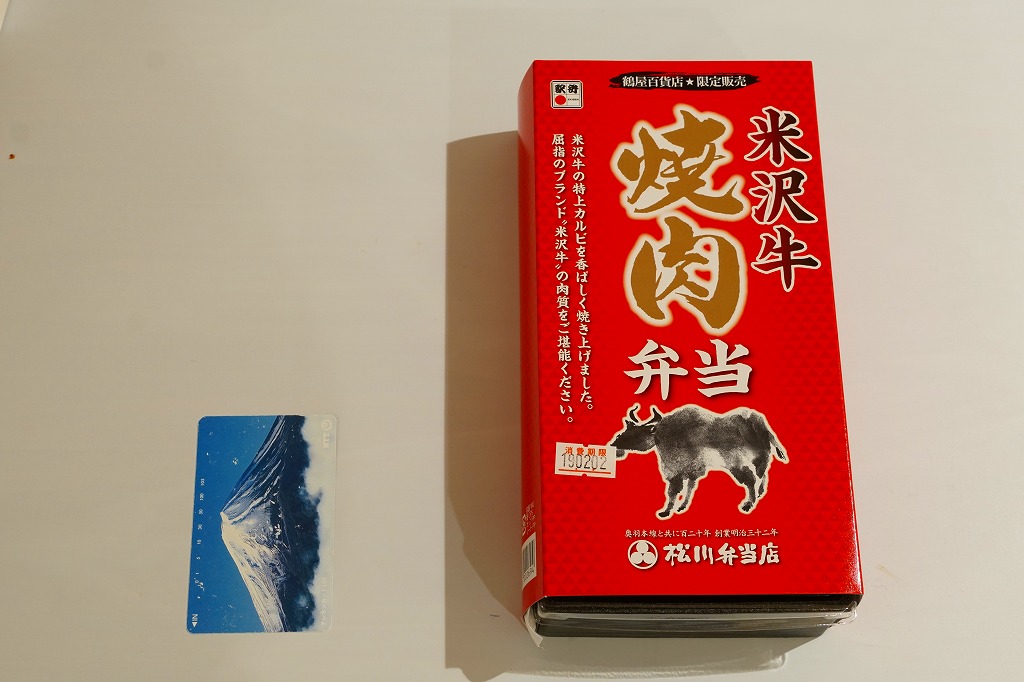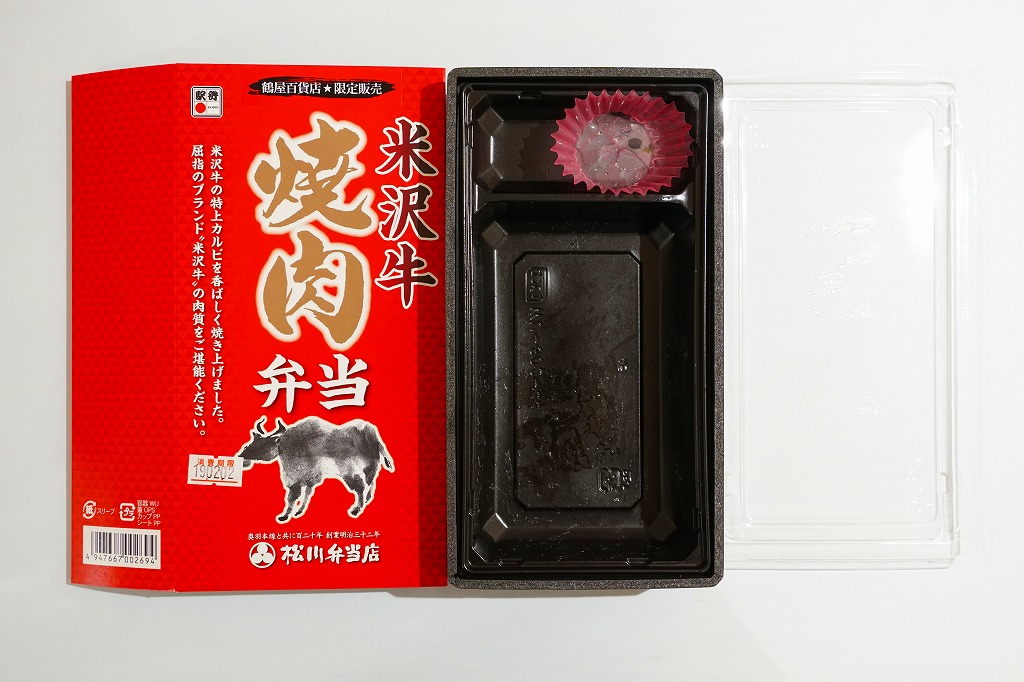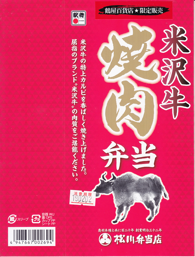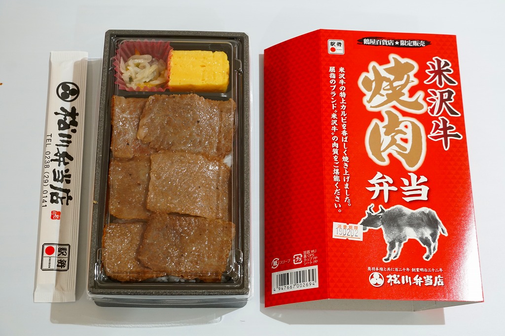 2019(平成31)年2月の鶴屋百貨店の駅弁大会で実演販売。米沢駅の駅弁屋がつくる、この催事での限定販売商品。会場では赤いスリーブに「鶴屋百貨店★限定販売」のシールをせっせと貼っていたため、この商品が他の場所で売られたことがあるのかもしれない。白飯を米沢牛の牛焼肉6枚で覆い、玉子焼と大根漬を添付。見た目は地味でも、肉の味はどんな米沢駅弁よりも上質感があったと思う。
