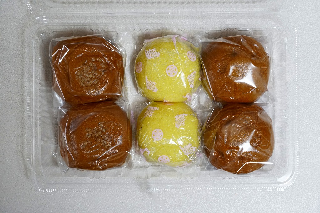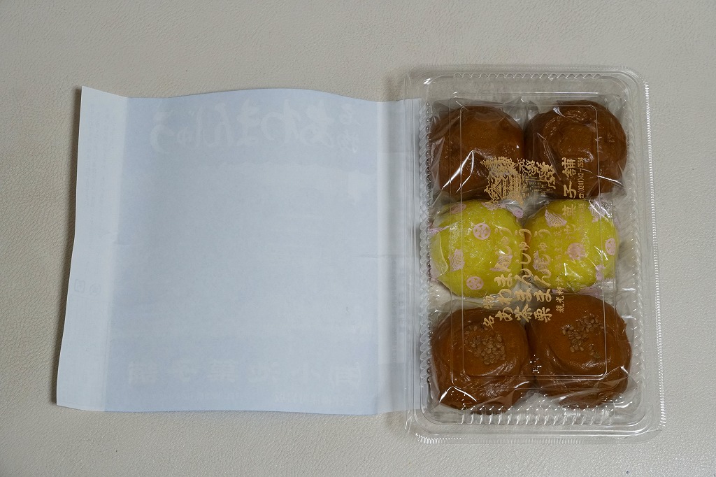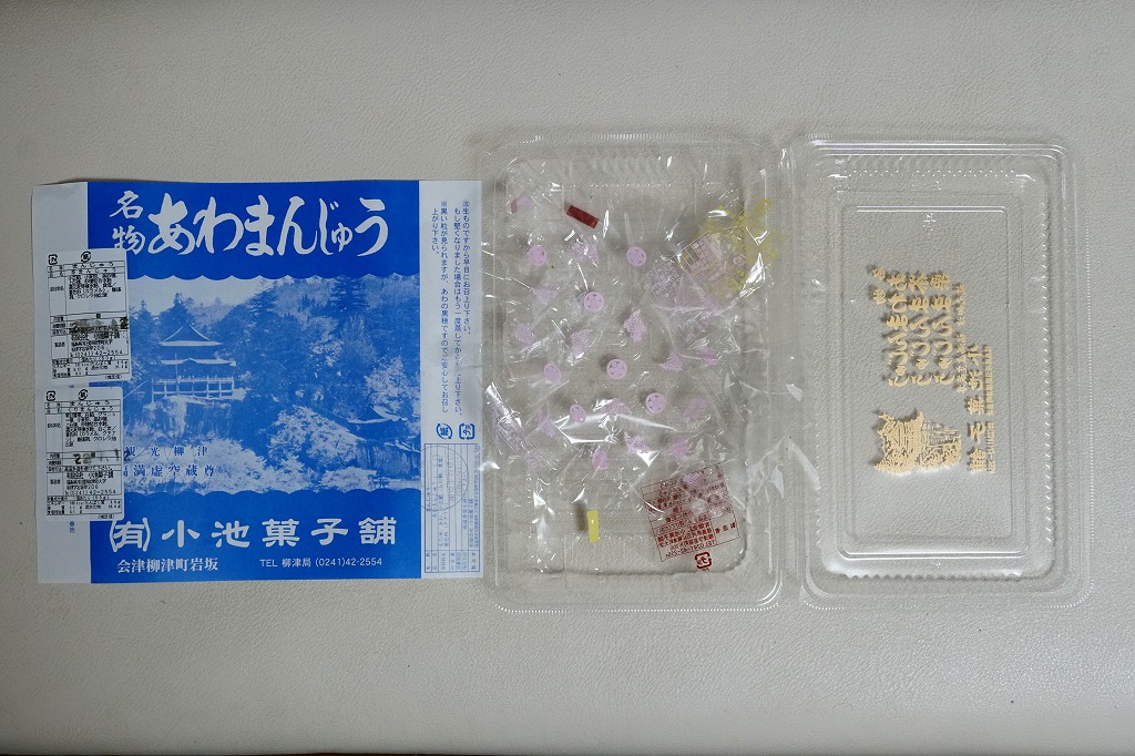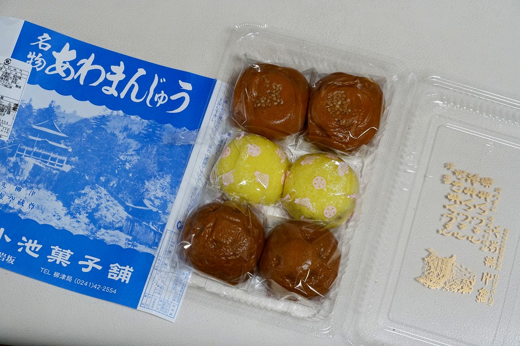 これは駅弁でも駅売り銘菓でもないが、駅名と同じ地名を名乗る郷土の銘菓であり、デパートの駅弁催事や物産展でも積極的に実演販売され、駅弁よりも人気に見える商品。イベントで只見線の会津柳津駅へ売りに来たこともあるらしい。昭和時代の土産物感が満載の掛紙は、観光柳津福満虚無蔵尊と記される圓藏寺(円蔵寺:えんぞうじ)の写真。生地に餅米と粟を使い、中身にこしあんを使う、不思議とみずみずしい、一口サイズの饅頭。今回は京王百貨店の駅弁大会で、あわまんじゅう2個、栗まんじゅう2個、茶まんじゅう2個を組み合わせたら840円だった。
