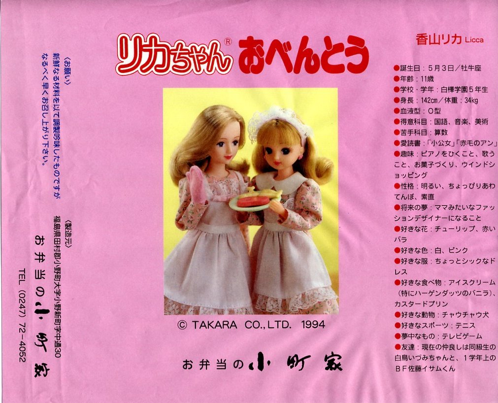 福島県田村郡小野町のランドマーク的な観光施設「リカちゃんキャッスル」付近の食堂兼弁当屋で販売された、同施設公認の注文生産弁当、つまりホカ弁。プラ製のホカ弁容器に、リカちゃん人形の写真やプロフィールを掲載する薄い掛紙を巻き、輪ゴムで留める。中身はピラフ、オムレツ、クリームコロッケ、エビフライ、ハンバーグ、ウインナー、スパゲティ、鳥唐揚、キャンディ、オレンジ、プリン。購入時にミニ玩具(リカちゃんと関係なし)をひとつ選べた。