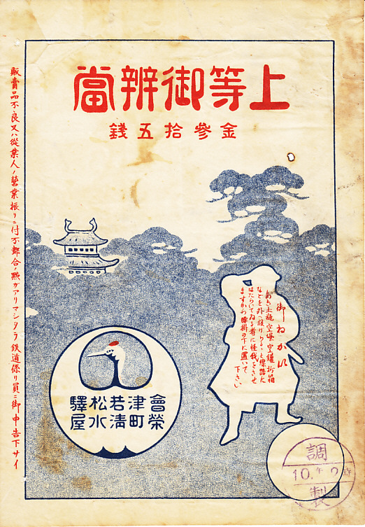 第二次大戦前の調製と思われる、昔の会津若松駅弁の掛紙。調製元は「榮町清水屋」とある。掛け紙に描かれる城は、この頃には実在しなかったはずの鶴ヶ城だろうか。