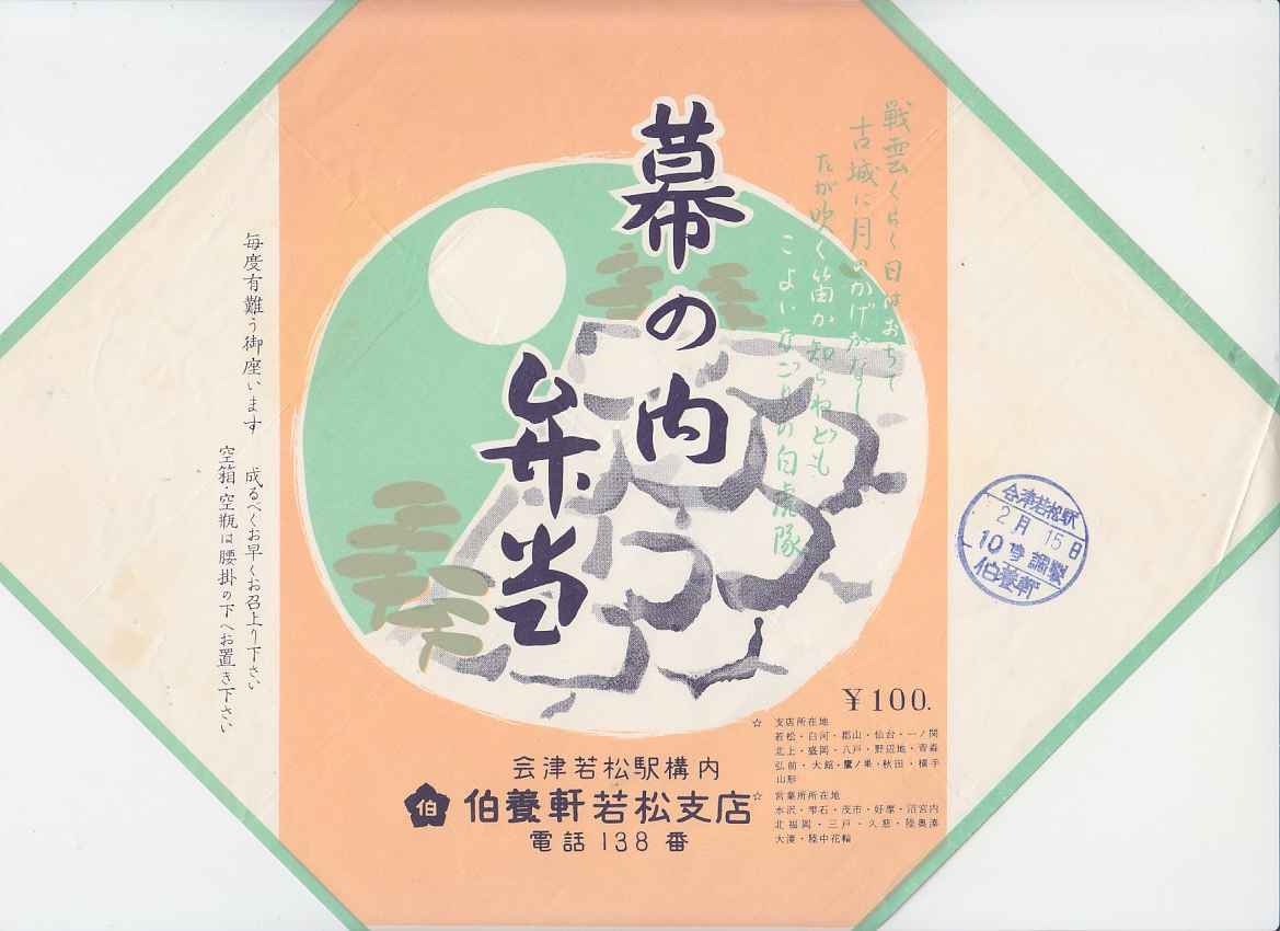 1960年代の、2月15日10時の調製と思われる、昔の会津若松駅弁の掛紙。となると、まだ天守が再建されていない、鶴ヶ城の石垣を描いたと思う。戦雲くらく日はおちて、で始まる白虎隊の唄も記される。