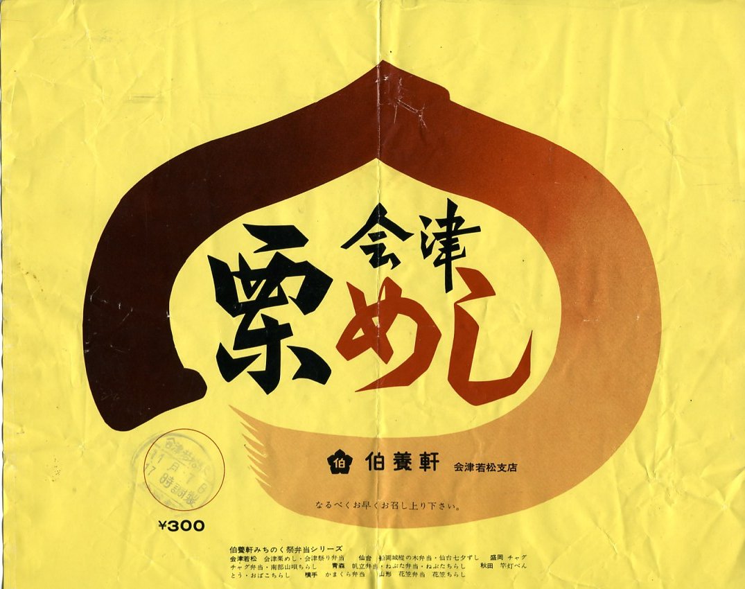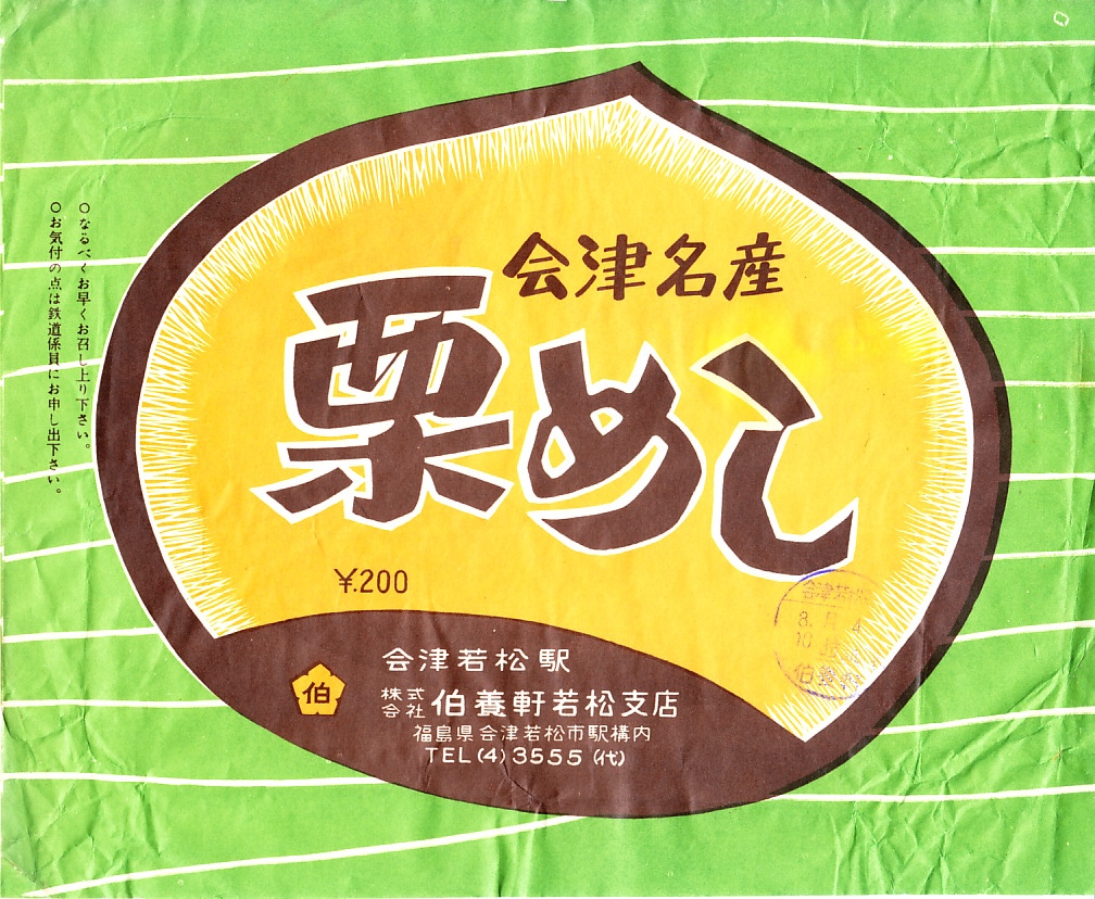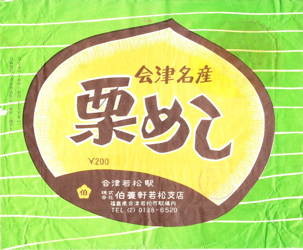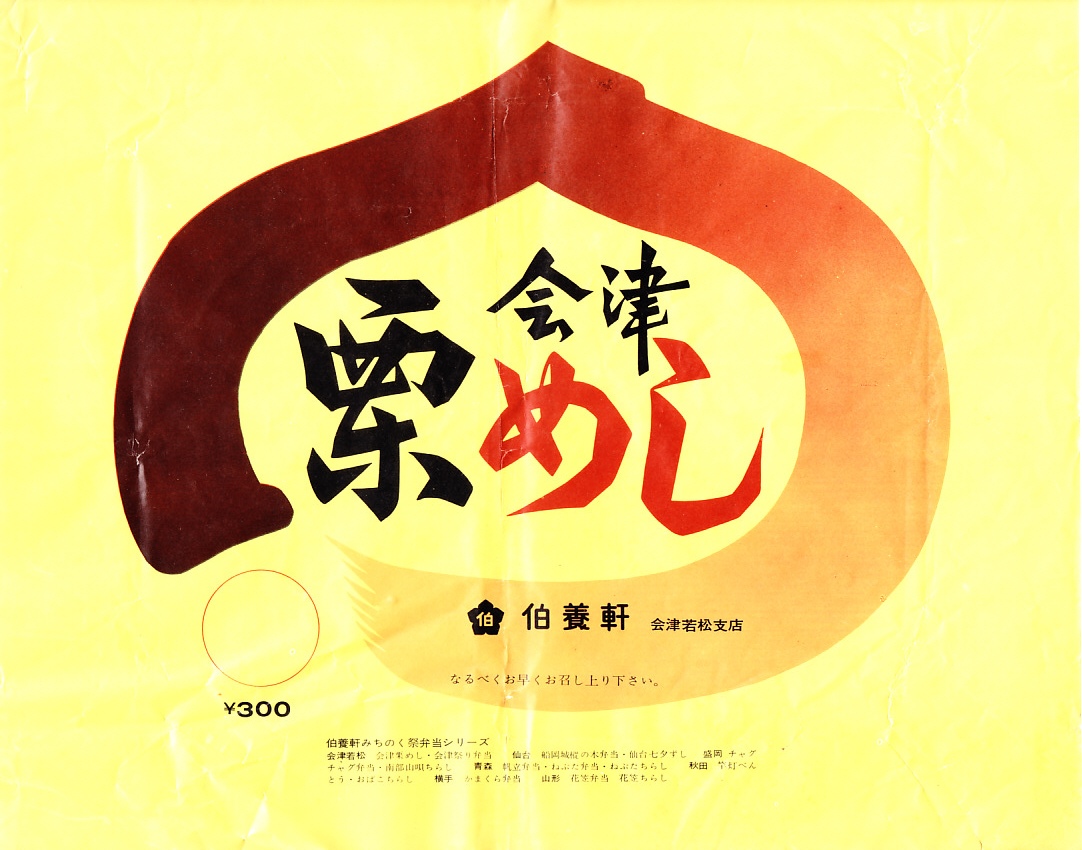 1970年代のものと思われる、昔の会津若松駅弁の掛紙。300円の価格から、1973年頃のものか。栗型で栗色の栗飯の掛紙。当時の伯養軒は「みちのく祭弁当シリーズ」として、会津若松駅「会津栗めし」「会津祭り弁当」、仙台駅「船岡城樅の木弁当」「仙台七夕ずし」、盛岡駅「チャグチャグ弁当」「南部山唄ちらし」、青森駅「帆立弁当」「ねぶた弁当」「ねぶたちらし」、秋田駅「竿灯べんとう」「おばこちらし」、横手駅「かまくら弁当」、山形駅「花笠弁当」「花笠ちらし」を持っていたことがわかる。他社の駅弁も含めているような気がする。