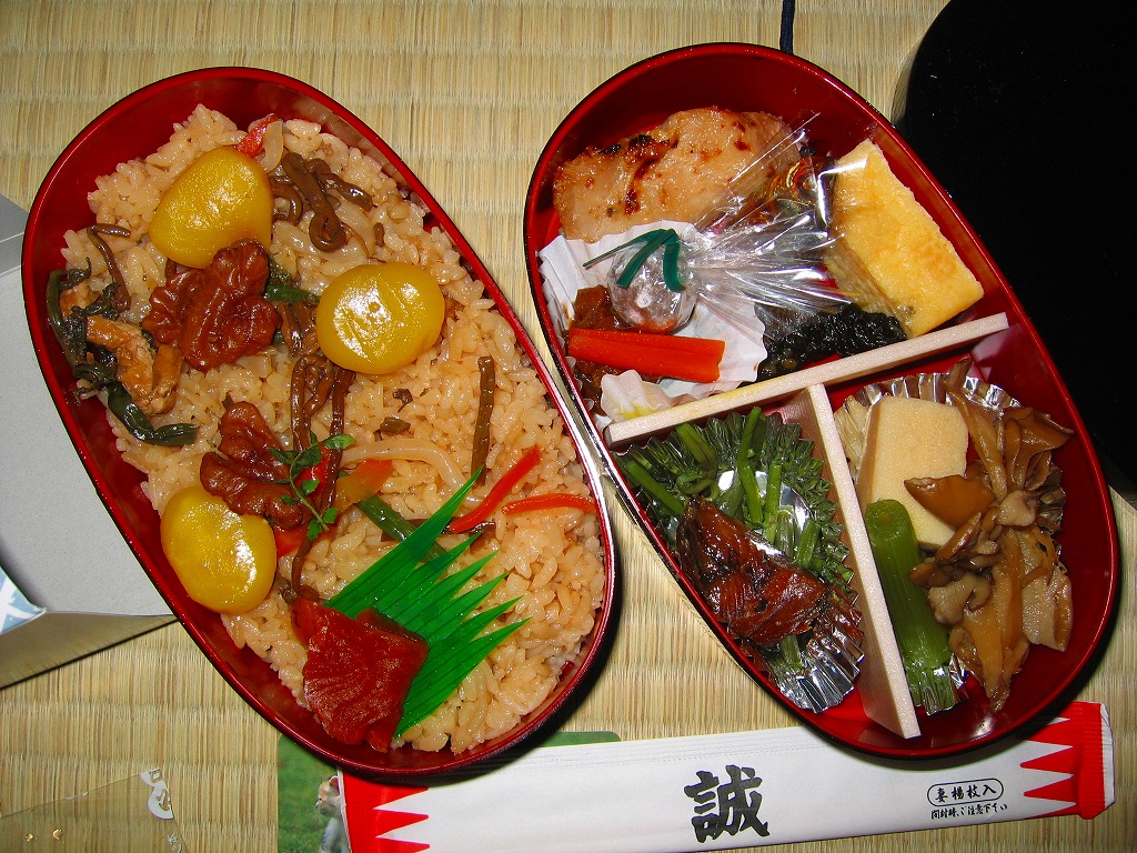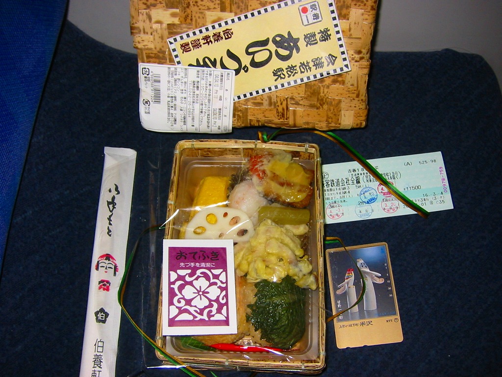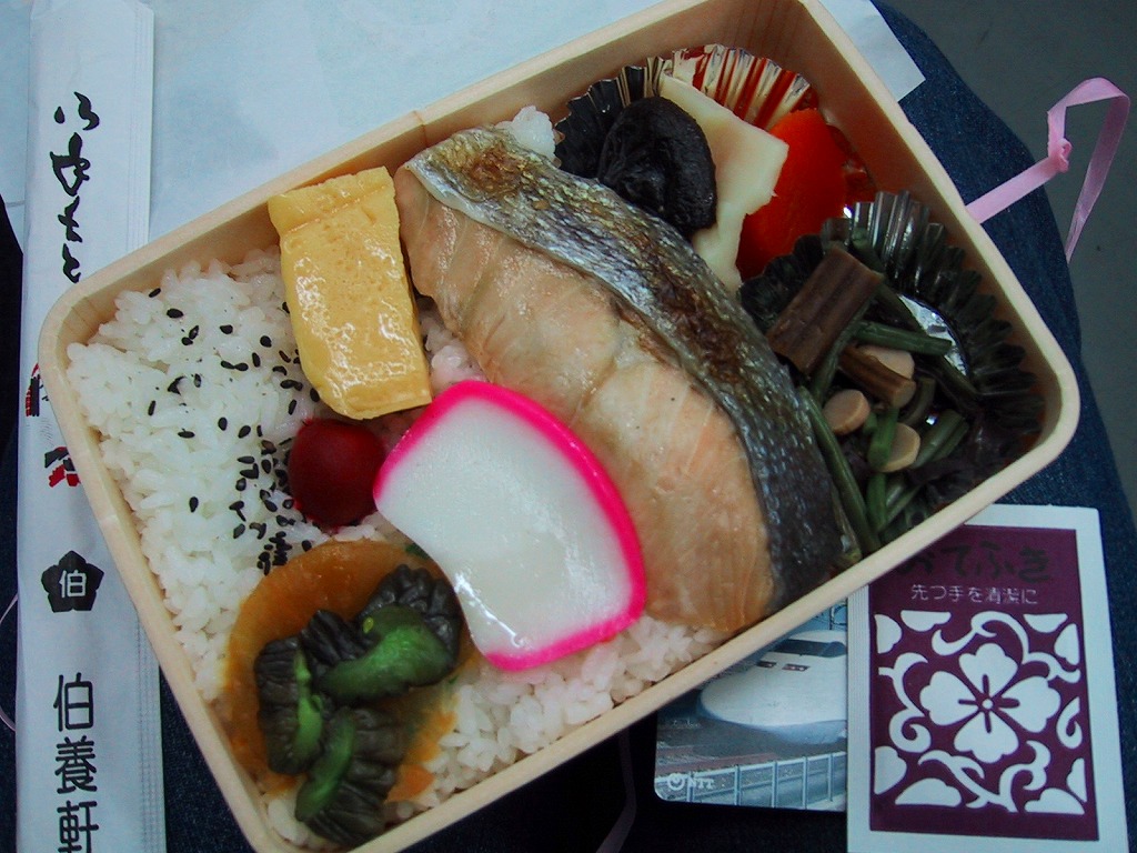 2002(平成14)年頃に発売。近年の駅弁業界で流行中の竹皮籠容器に、駅弁の名前と食品表示のシールを直接貼り、紙ひもで割りばしごとしばる。透明トレーに入った中身は、まるまる太った味噌焼にぎりとシソ葉巻にぎりがひとつずつ、煮ニシン、舞茸天、玉子焼、海老蒲鉾など。