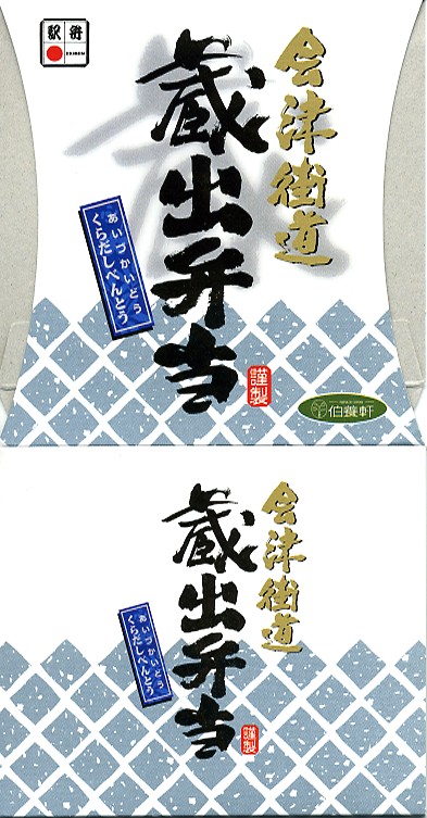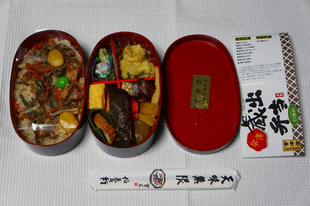 秋冬の駅弁大会シーズンに向けた、2003(平成15)年秋の新商品か。プラスティック製の黒い小判型容器は二段重ね、これを倉の壁をイメージしたデザインのボール紙枠にはめる。中身は下段が栗とクルミと山菜が軽く載った茶飯、上段が棒タラや身欠きニシンに鶏味噌焼やフナ甘露煮や味噌南蛮や厚焼玉子など。分量は少なめで少々の割高感はあるが品質も風味も見栄えも良く、会津をゆっくり巡る高めの年齢層に向く感じ。容器も小物入れに適す。
