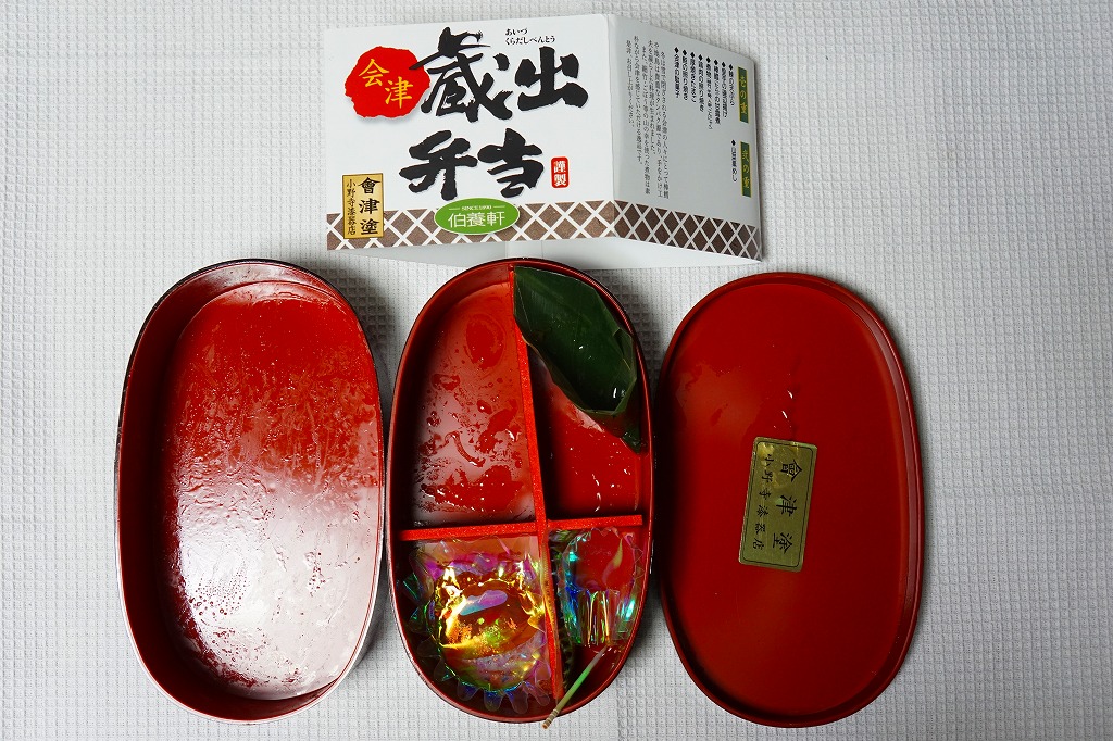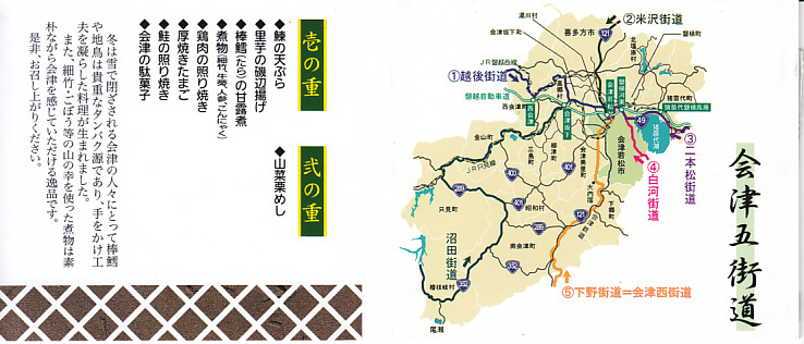 2012(平成24)年2月までに発売。下記の「会津街道蔵出弁当」と、名前は少し異なるが、内容はほぼ同じ。「會津塗」と書いてある、小判形あるいは楕円形の黒いプラ製容器を重ね、下段に山菜栗めし、上段にニシン天ぷら、サケ照焼、鶏照焼、タラやコンニャクなどの煮物、玉子焼、あん玉などを詰める。
