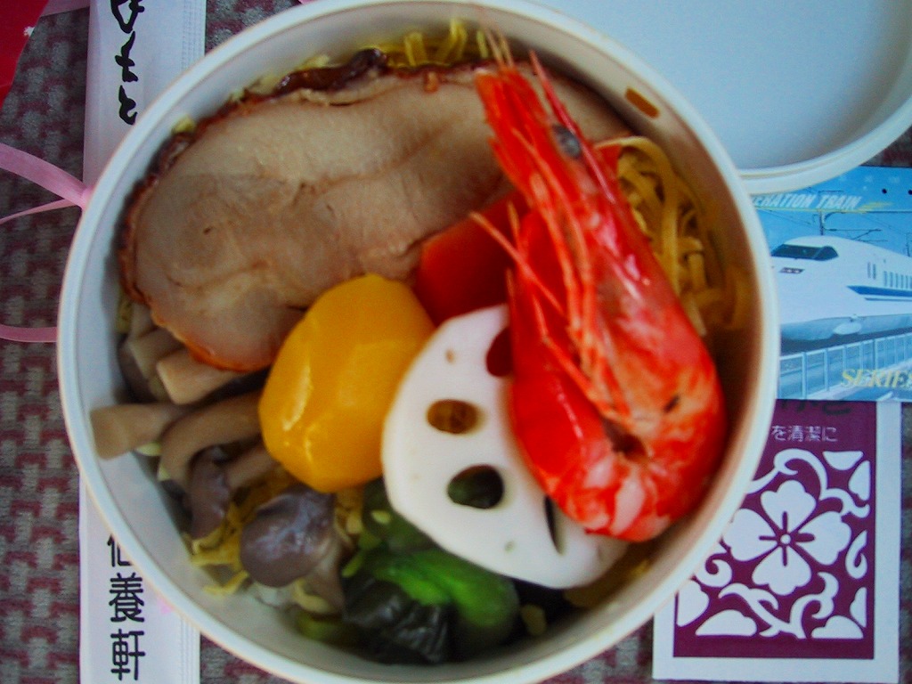 こけしの頭を模したプラスティック製の容器に、掛紙をかけてひもでしばる。中身は茶飯の上に鶏肉、殻付海老、しめじ、栗などを載せるもの。風味や食材の調和はイマイチも、さすが東北の駅弁で飯はうまい。中身は会津や福島や駅弁屋さんとの関連性を見い出せないため、容器を見て持ち帰って楽しむ駅弁。