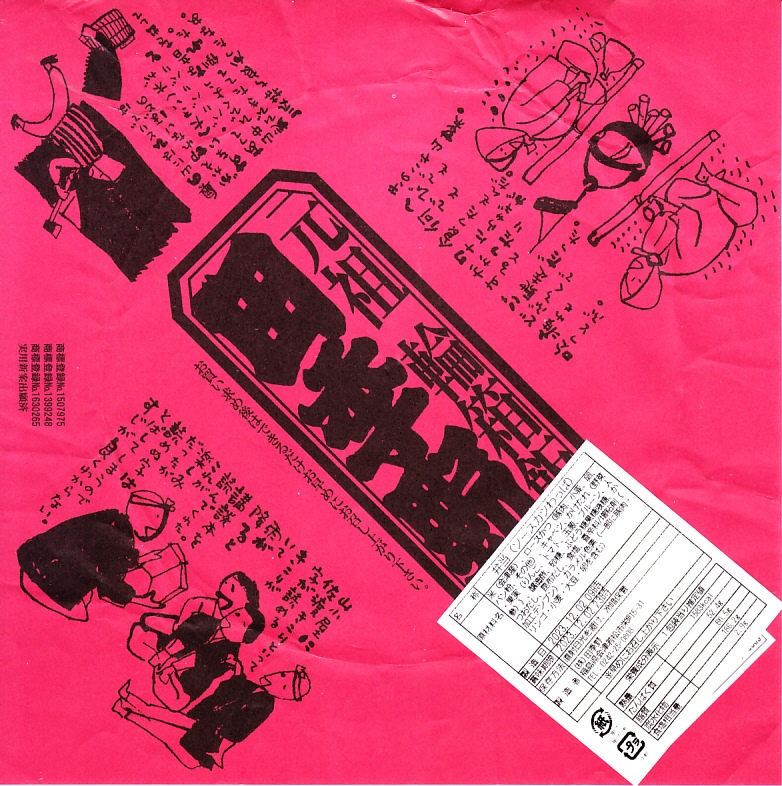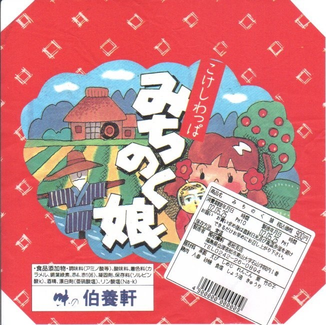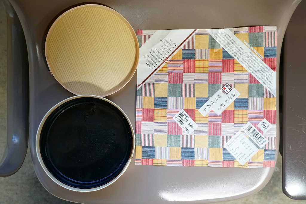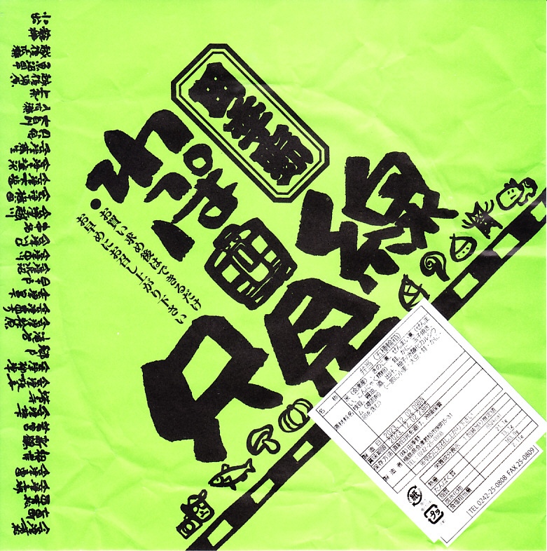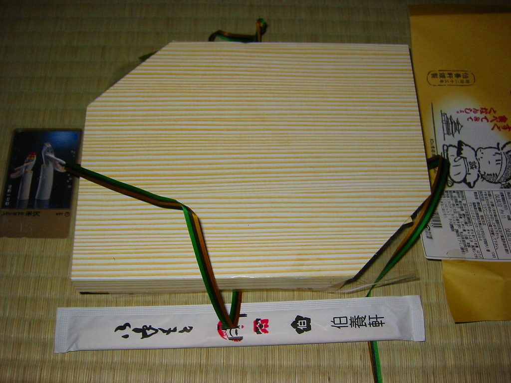 2003(平成15)年頃に発売。2004年のNHK大河ドラマ「新選組!」放送にちなんだものか。東北地方でよく見掛ける、内部を細分する長方形二角落としの容器に木目紙のふたと割りばしを置き、ファンシーな掛紙をかけて紙ひもでしばる。