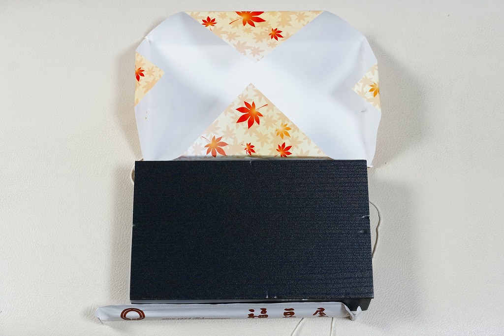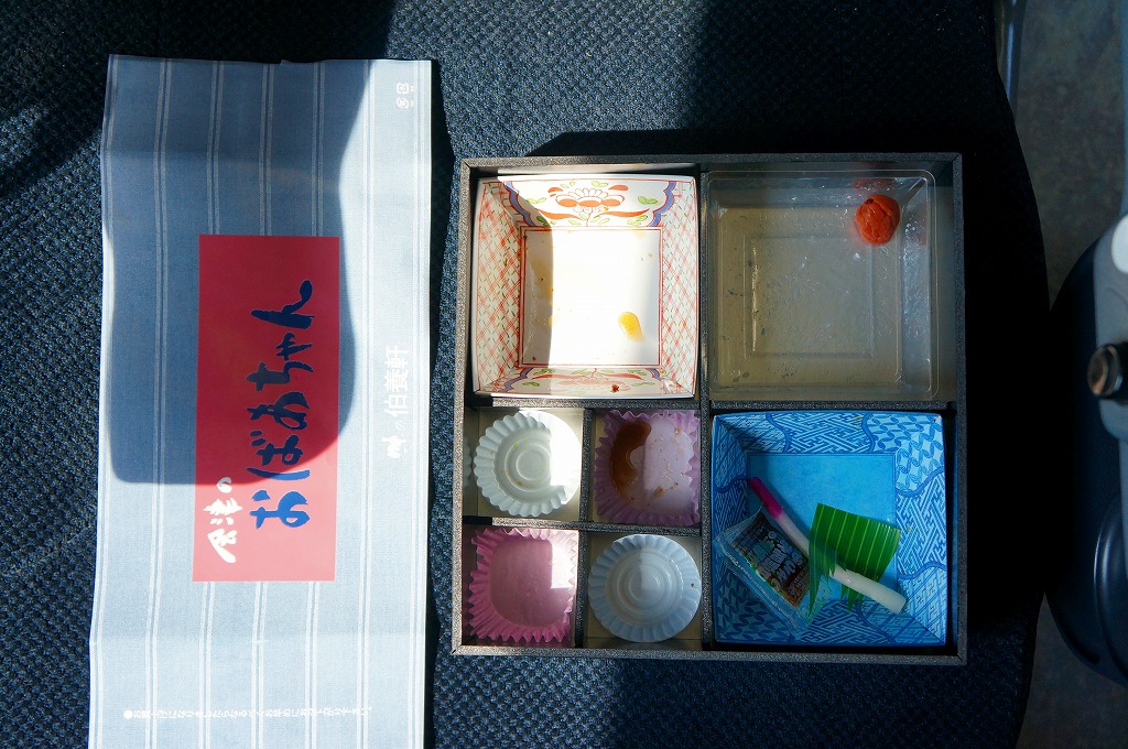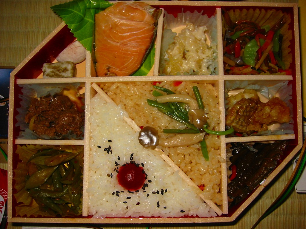 JR東日本の観光キャンペーン「LOOK EAST」のオリジナル駅弁131種類のひとつとして、1989(平成元)年3月に発売か。真っ黒な正方形の容器に、駅弁と調製元の名前をシンプルに記した掛紙を巻く。大3個と小4個の正方形に仕切られた中身は、日の丸御飯、棒ダラにがんもどきやシイタケなどの煮物、ニシン天と玉子焼と鮭えごま味噌焼などのおかず、馬肉煮や山菜煮や漬物にあん玉などの付合せ。