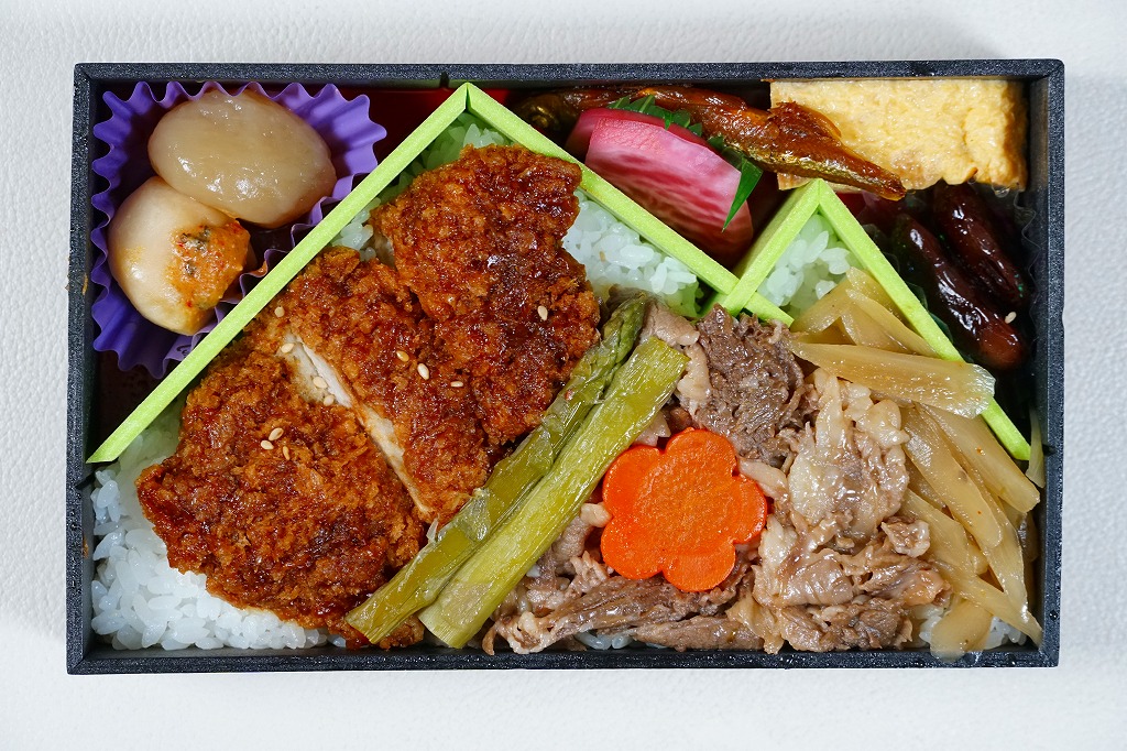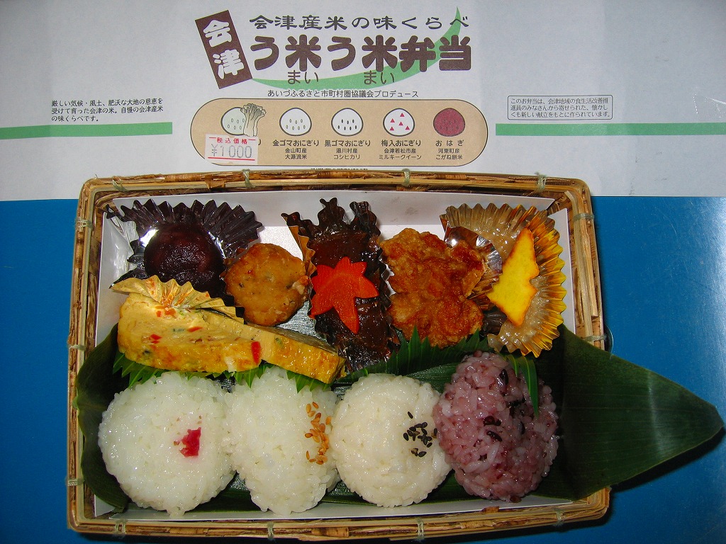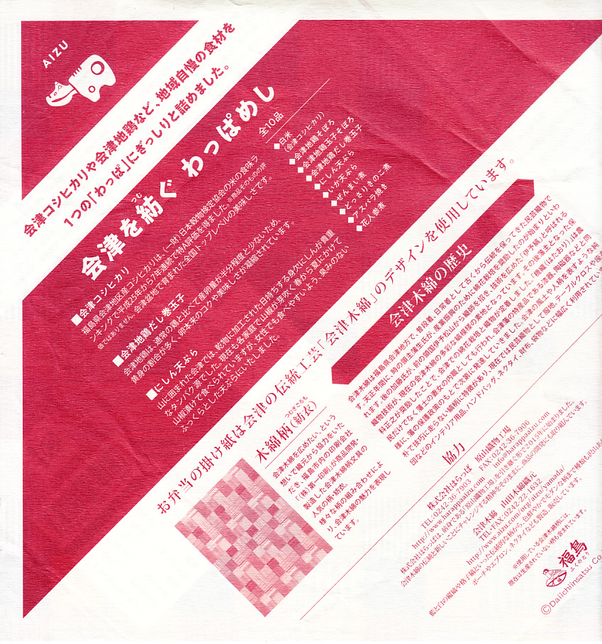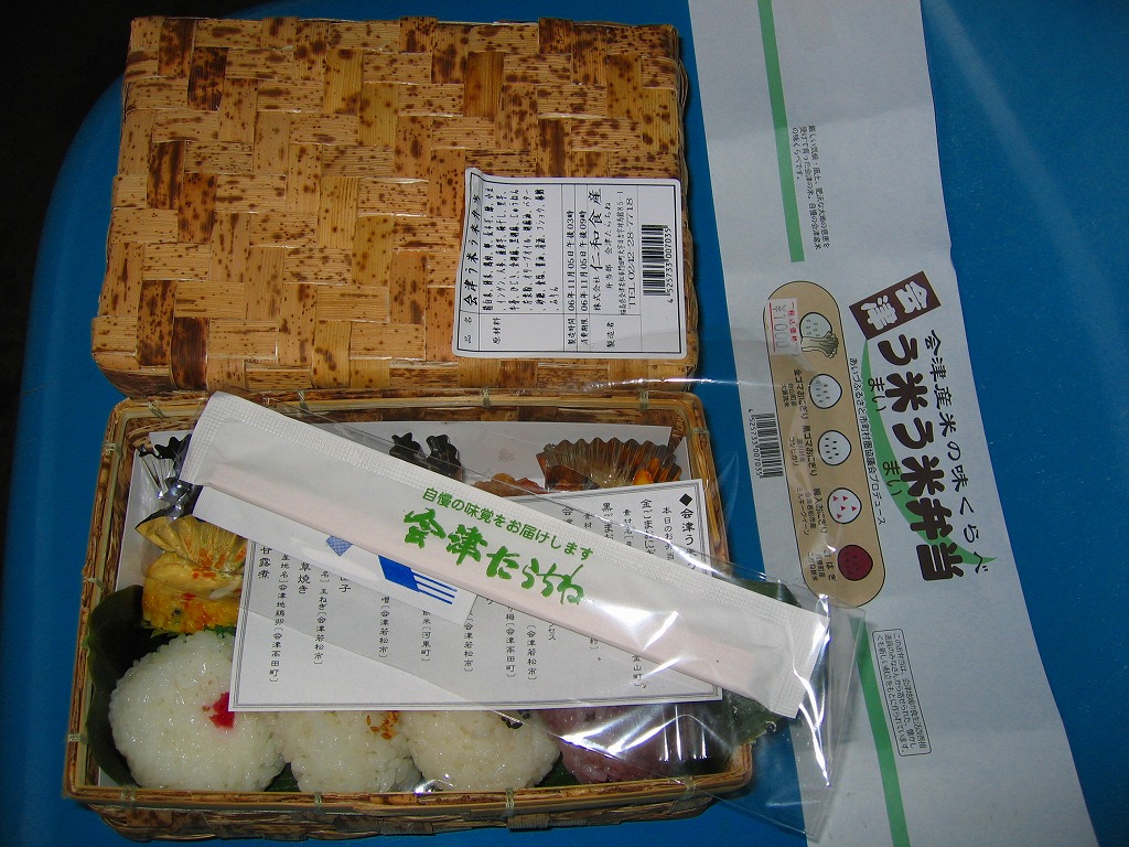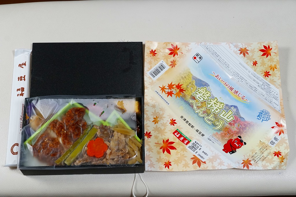 掛紙に「会津若松駅」とあるので、この駅の駅弁という位置付けなのだろう。調製元の郡山駅の駅弁で時々使われる、仕切りで山並みあるいは会津磐梯山を思わせる黒い長方形の容器を、秋の五色沼と会津磐梯山を描いた大きな掛紙で包む。発売時の絵柄は新緑の猪苗代湖と会津磐梯山であり、キャラクターのポストカードを付けていた。この容器の山体の部分に会津産コシヒカリの白飯を詰め、ソースカツ、牛肉煮、アスパラ焼き、きんぴらごぼう、花にんじんで覆い、こんにゃく煮とさといも煮、会津地鶏の玉子焼き、わかさぎ佃煮、花豆、漬物を添える。おいしいお肉と会津の雰囲気がしっかりした、骨太の駅弁。