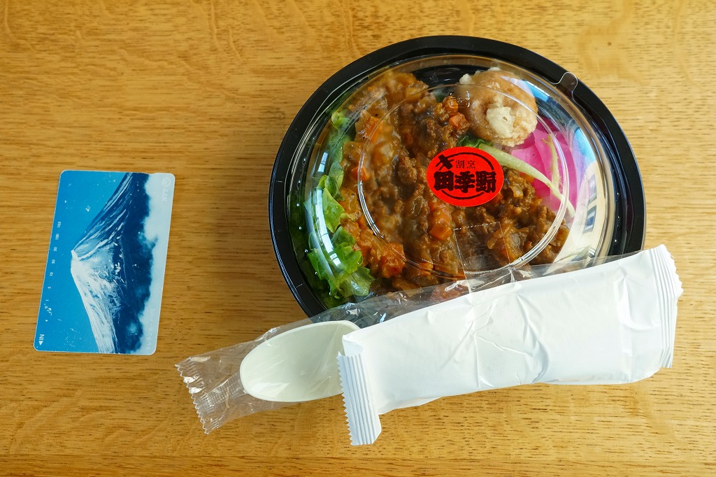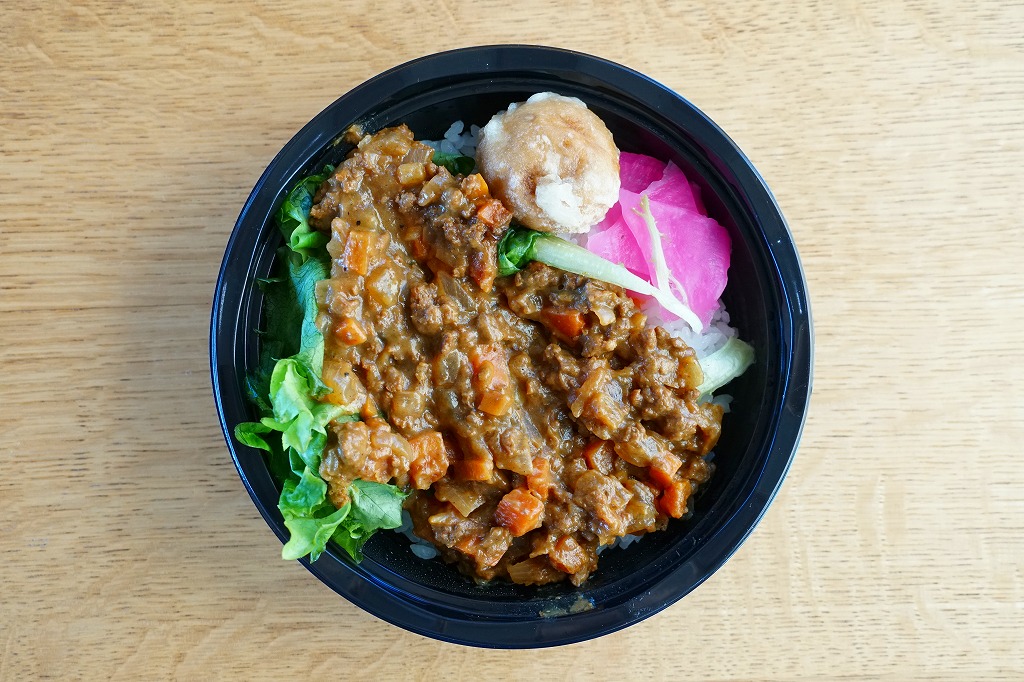 中身は、白御飯を豚挽肉とニンジンとタマネギのカレーで覆い、大根桜漬とまんじゅうの天ぷらを添えるもの。「まかない丼」なので中身は一定でなく、今回はたまたまキーマカレーで、天丼や鶏丼などになることもあり、しかし添え物は毎回同じらしい。福島県会津地方では、まんじゅうを天ぷらにして食べる習慣があるそうなので、その点が、その点だけが会津ならではか。調製元は会津若松の中心市街地にある割烹料理店。
