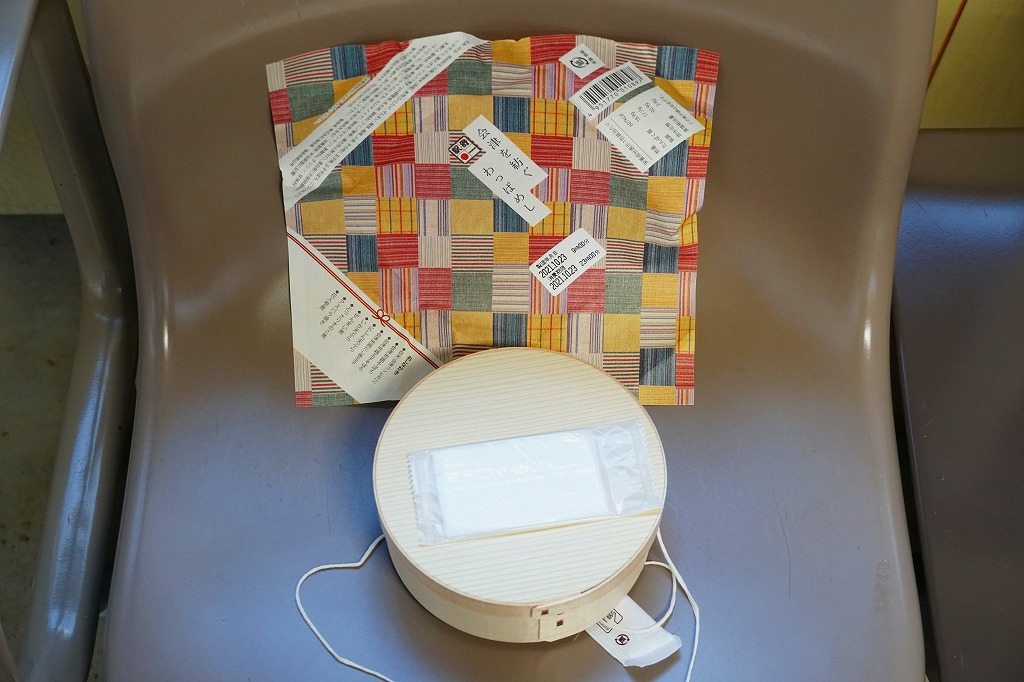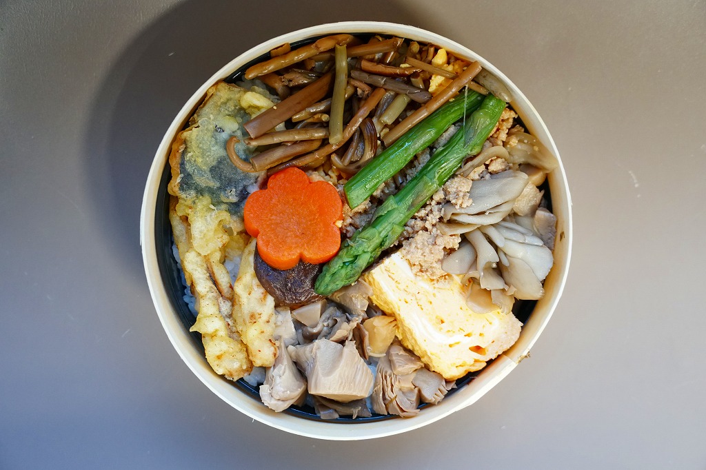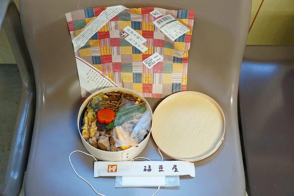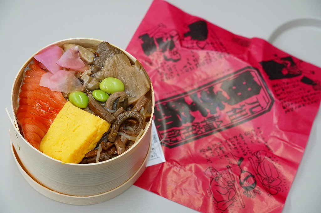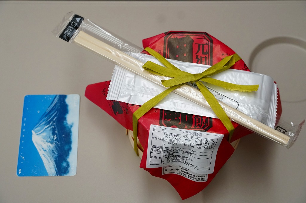 木製の枠に同柄のボール紙を貼り付けた丸いわっぱを、会津木綿の柄と質感を持つ掛紙で包む。掛紙の裏面には駅弁の特徴と、協力者として織物工場と木綿織元の名も記す。中身は会津コシヒカリの白飯を、会津地鶏のそぼろ、玉子そぼろ、だし巻玉子、ニシンとイカの天ぷら、ゼンマイ、きのこ煮、アスパラ、にんじんで覆うもの。鶏肉と天ぷらで味のあるキノコ丼。一緒に輸送される郡山駅の名物駅弁とともに、今度こそ駅での販売が定着するか。価格は2020年の発売時や2021年の購入時で1,000円、2023年時点で1,100円