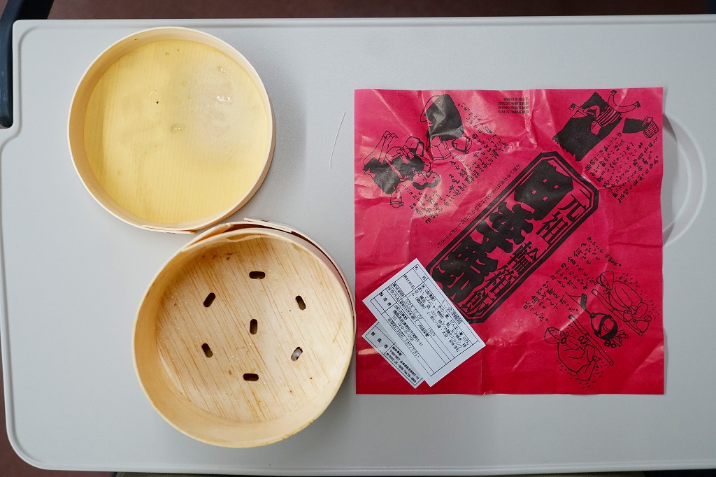 1967(昭和42)年1月28日の調製と思われる、昔の会津若松駅弁の掛紙。絵柄も栗型、容器も栗型、手前が栗ごはんで奥がおかずの、当時典型的な栗飯駅弁だった。