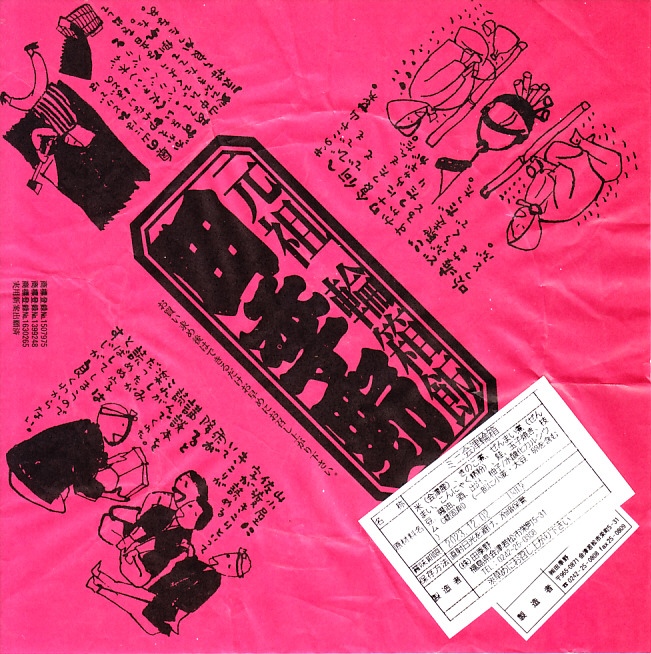 1970年代の調製と思われる、昔の会津若松駅弁の掛紙。3枚の調製印はそれぞれ異なるけれど、黄色い栗のイメージの掛紙はまったく同じ。鉄道に関する記載がないため、仕出し弁当向けの掛紙だろうか。