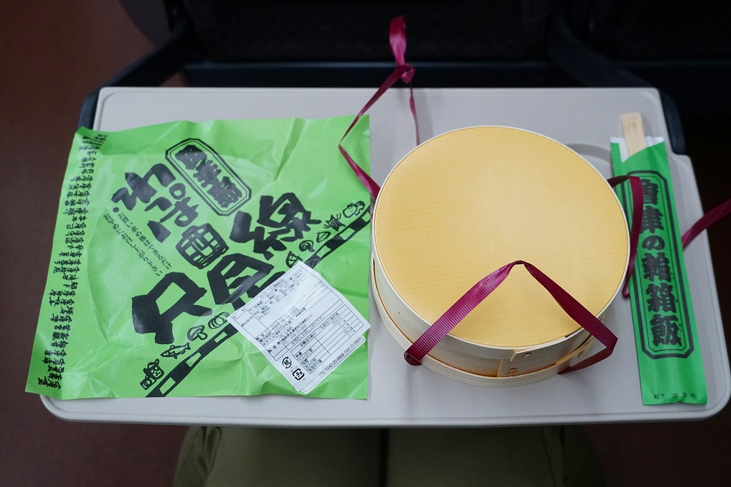 会津若松駅で駅弁も売るコンビニ「ニューデイズ」で、2022(令和4)年11月14日に発売。調製元は会津若松市街の中心部にある割烹料理店で、会津鉄道の車内弁当や会津若松バスターミナルのバス弁も手掛ける。同社の食堂や弁当で1970年から提供される看板商品「輪箱飯(わっぱめし)」のうち主力の「五種輪箱」に、JR只見線の2022年10月の全線運転再開を記念し、只見線の名とすべての駅名を記した緑色の掛紙をかけて、JR会津若松駅へ卸し始めたのではないかと思う。