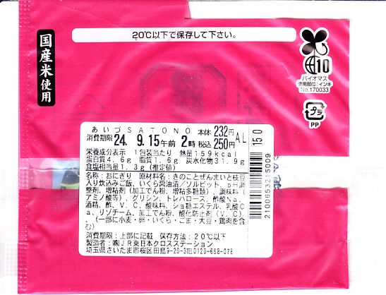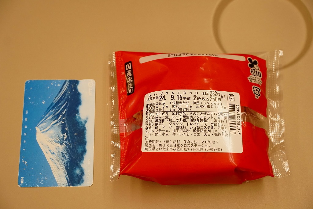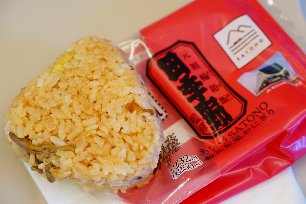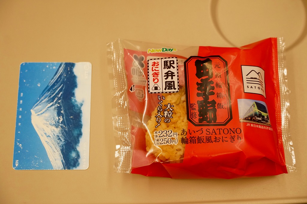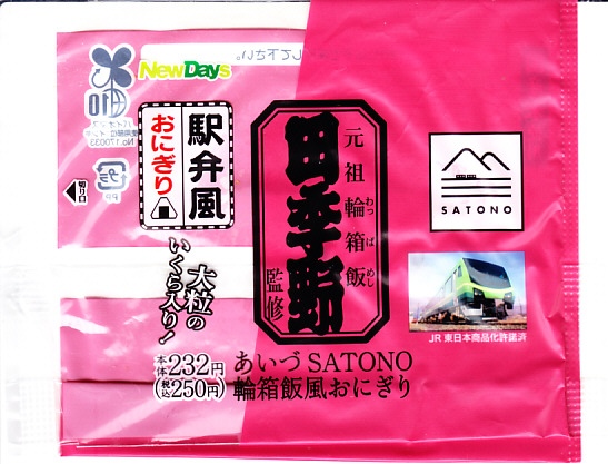 2024(令和6)年8月27日から9月16日まで、北東北を除くJR東日本の駅売店「ニューデイズ」で販売。JR東日本クロスステーションの販売促進キャンペーン「東北信越フェア2024」の一環で投入した多種のコンビニ商品のひとつで、観光列車「SATONO」とのコラボ商品として、おにぎりと弁当も展開した。同列車の車内限定弁当「あいづSATONO輪箱飯」をイメージしたおにぎりとして、きのこ煮とゼンマイ煮を混ぜた御飯にイクラを詰めた。包装の見た目では会津若松駅で買える弁当「元祖輪箱飯田季野(ソースカツわっぱ)」に思えて、中身はまるで違った。調製元は各地のコンビニおにぎり製造所になると思われる。