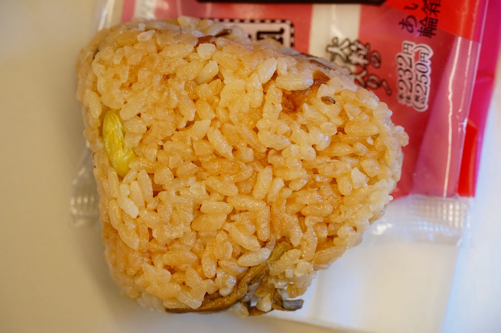 2000年以降に多くの駅弁で使われ始めている竹皮編み容器に、駅弁の名前と中身をちょっぴり紹介する紙帯を巻いて、値段シールと食品表示ラベルを貼る。中身は小さな舞茸おにぎり、金ゴマおにぎり、黒ゴマおにぎり、梅入おにぎりが笹の葉に載って各1個、それにニシン味噌、鶏唐揚、黒豆団子、おから玉子焼、棒だら甘露煮を添える。この分量で千円も取るので割高感はあるが、具の一個一個が小粒でかわいらしく、駅弁に必要な個性をしっかり備えている。それに確かに、米がクールにうまかった。