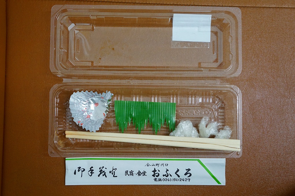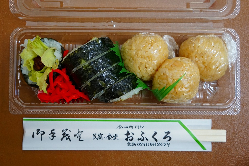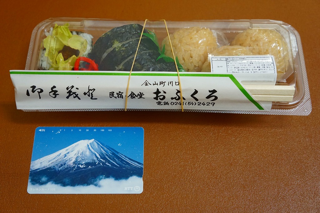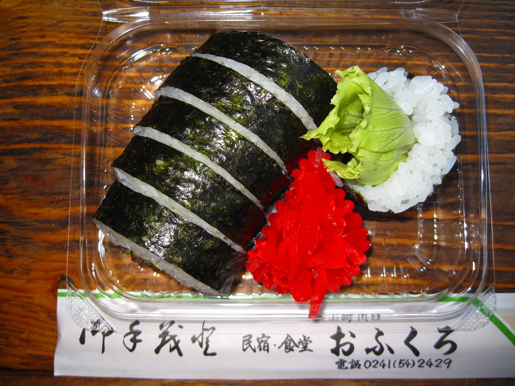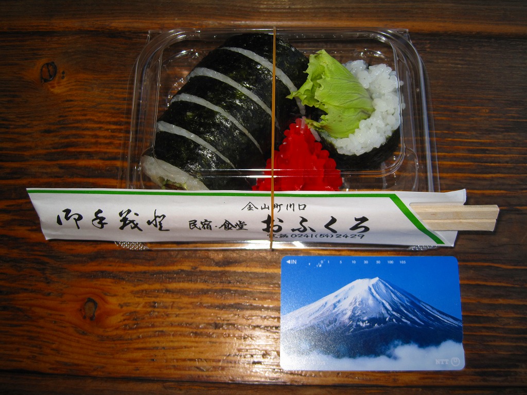 ずんぐりむっくりの海苔巻きが1本分、6切れにカットされて透明なプラ製の惣菜容器に収まる。その中身は、5ミリ角しかないけれどサクサク感が抜群な棒状の甘辛なトンカツを芯に、レタスと白御飯と海苔を巻いたもの。まさかここでこういうものを買えるとは思わなかった。食品表示ラベルによると地元の個人が、箸袋によると民宿・食堂「おふくろ」が調製しているようで、こうやって駅構内の売店に卸してあれば、只見線で唯一の駅弁と呼べるかもしれない。